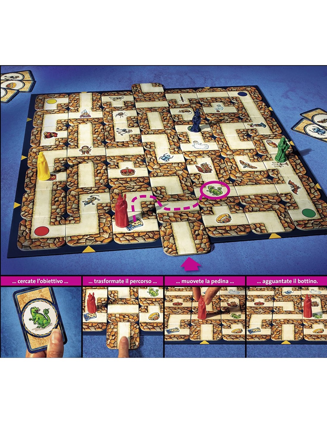 Il gioco è per 2-4 giocatori che si sfidano alla caccia ai tesori tra le mura del Labirinto; ad ogni mossa il tabellone del Labirinto si trasforma, ma le regole per giocare sono semplici: vince chi per primo raggiunge i propri tesori obiettivo
