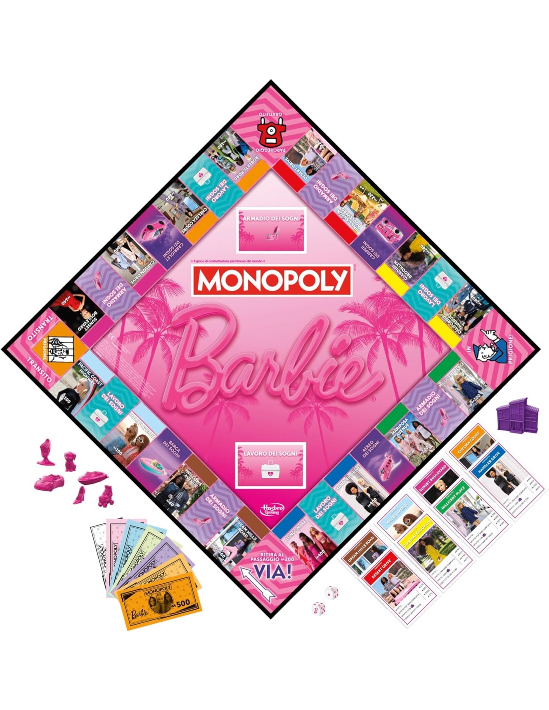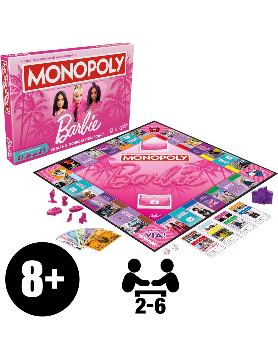 GIOCO MONOPOLY ISPIRATO A BARBIE: entra nel mondo dei tuoi sogni! Il gioco da tavolo Monopoly: Barbie Edition unisce la moda, i luoghi e i temi di Barbie alla giocabilità classica di Monopoly CASE DEI SOGNI E TABELLONE PERSONALIZZATI: spostati lungo il tabellone per comprare famose vie di Barbie, costruire Case dei Sogni e riscuotere l'affitto! Vince il giocatore che possiede più denaro dopo che il primo sarà andato in bancarotta 6 PEDINE ROSA IN ZINCO: sogna in rosa! Scegli tra 6 pedine in zinco ispirate a Barbie del suo colore distintivo: Cane, Scarpa, Macchina sportiva, Motoscafo, Pattini e Barbie stessa SOGNA IN GRANDE, RAGGIUNGI TUTTI I TUOI OBIETTIVI E SII TUTTO CIÒ CHE DESIDERI: astronauta? Insegnante? CEO di una casa di moda? Ogni giocatore pesca una carta Sii tutto ciò che desideri per scegliere una carriera. Poi tira il dado Barbie e mette in mostra le sue esclusive abilità professionali CARTA ARMADIO DEI SOGNI E LAVORO DEI SOGNI: "il tuo microfono si è spento proprio durante il tuo concerto 'Sogna in rosa', che ha registrato il tutto esaurito! In prigione!". Queste carte aggiungono colpi di scena con alcuni dei momenti più famosi della moda e della carriera di Barbie OTTIMO GIOCO PER FAMIGLIE: stai cercando giochi divertenti per le serate in famiglia? Riunitevi per un po' di divertimento, ispirazione e risate con questa elegante edizione Barbie del gioco da tavolo Monopoly REGALO PER GLI APPASSIONATI E LE APPASSIONATE DI BARBIE: i giochi da tavolo per famiglie sono ottimi regali dagli 8 anni in su e il gioco Monopoly: Barbie Edition è un fantastico regalo per ragazze, ragazzi e bambini che amano i giocattoli Barbie