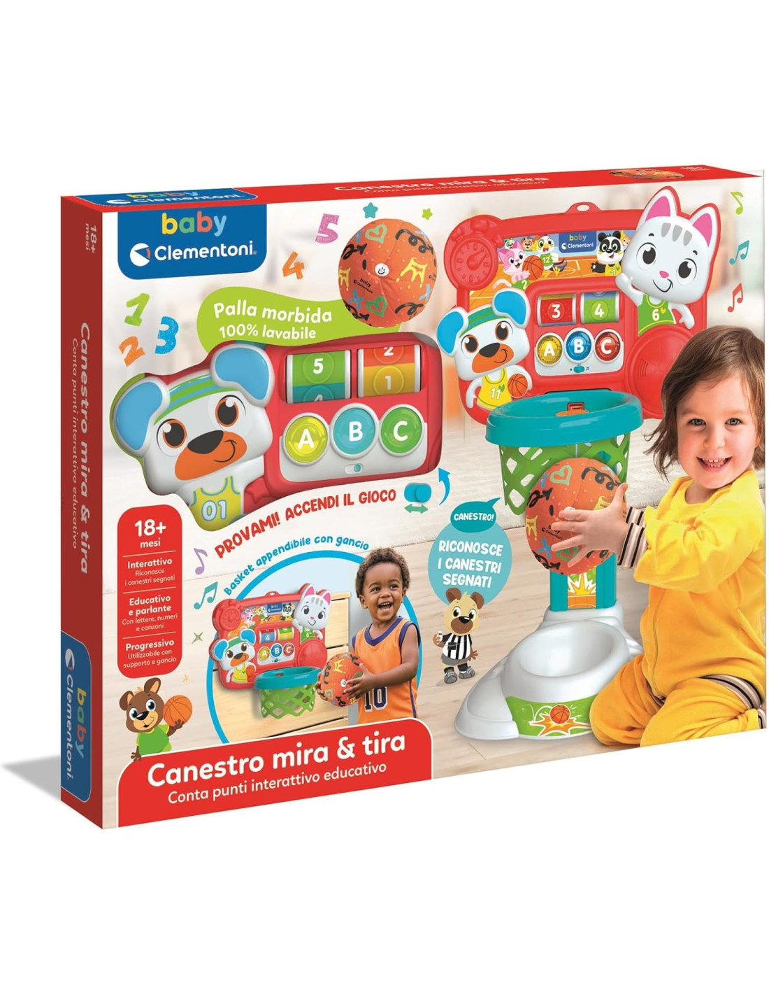 CANESTRO MIRA E TIRA: un canestro interattivo parlante con rulli segnapunti, tasti e lettere luminose, musica, suoni e una palla in stoffa morbida 100% lavabile, offrendo un'esperienza di gioco coinvolgente