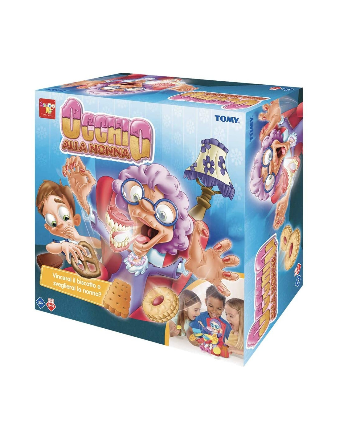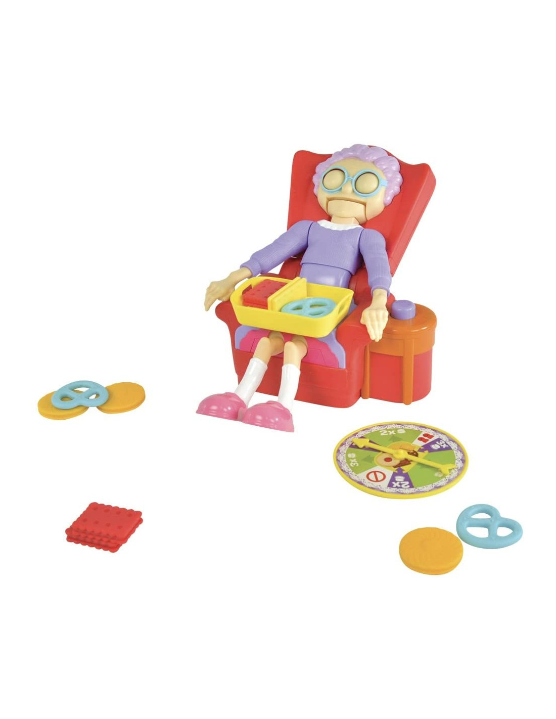 Include: 1 nonna in poltrona (2 pezzi), 1 ruota dei biscotti, 12 biscotti.