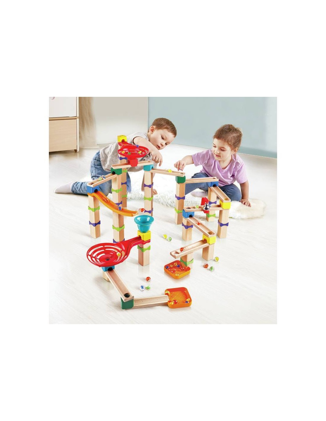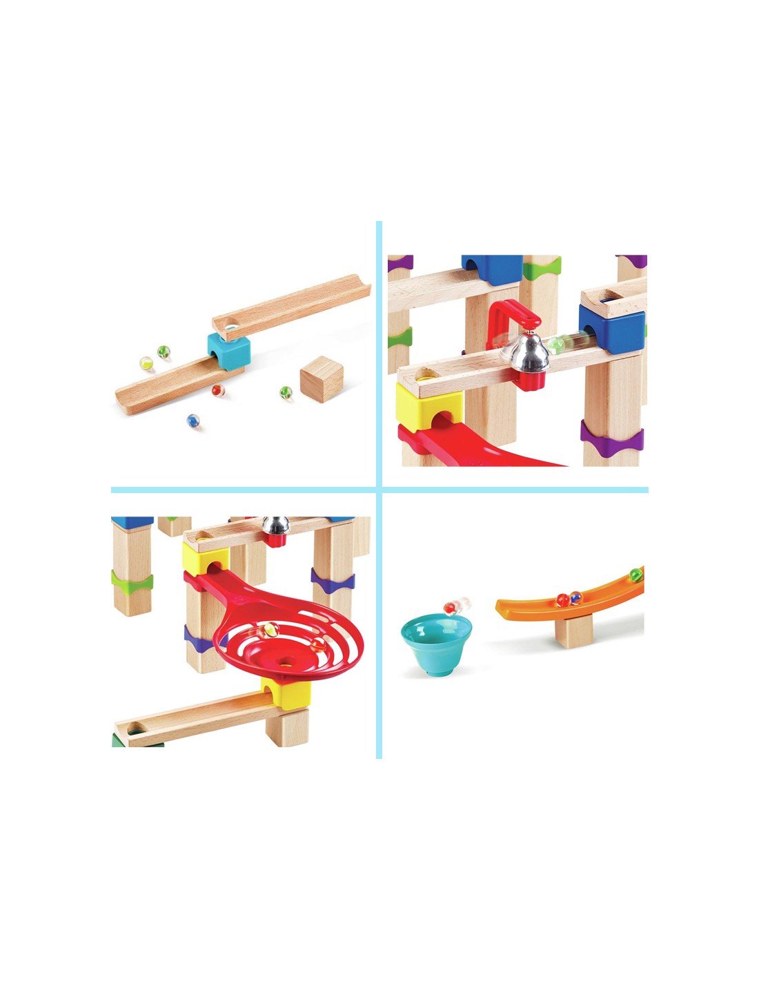 Il set contiene 129 pezzi. Installa i blocchi e i binari ed osserva come le biglie scompaiono attraverso i buchi e rotolano giù per le curve su una pista piena di sorprese.