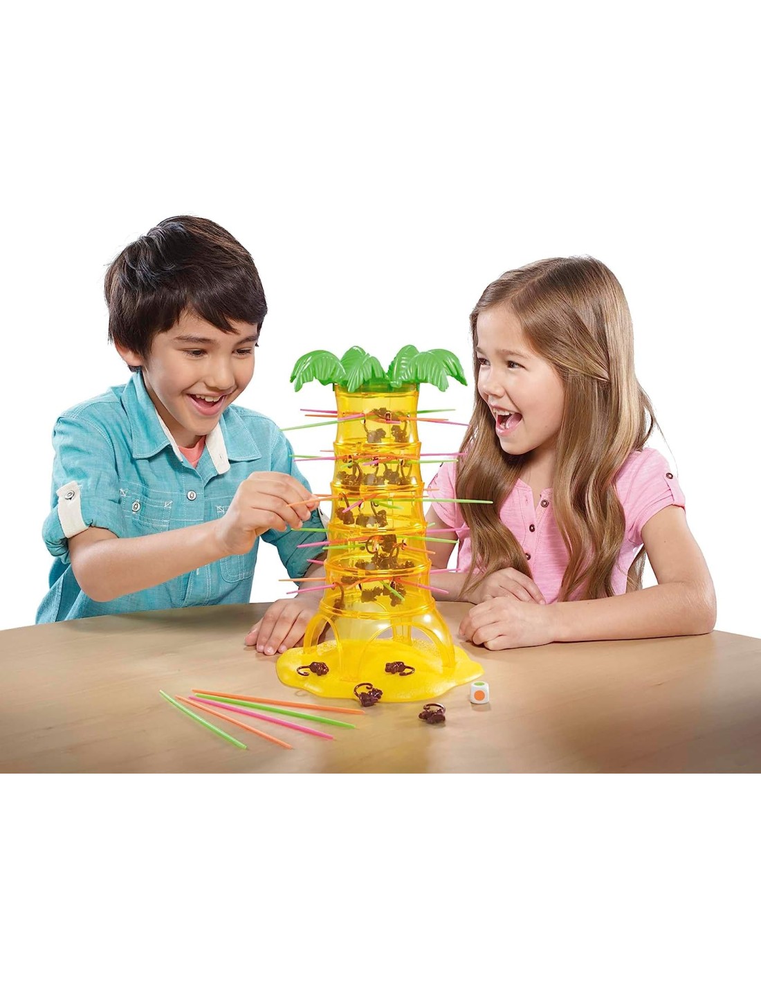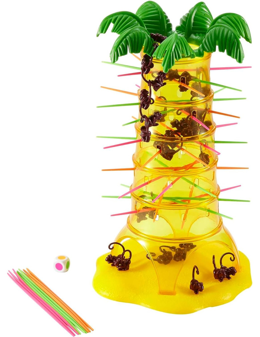 Il gioco Salva le Scimmie è così facile da imparare e divertente da giocare che i genitori e i bambini ne andranno matti! Create una griglia di bastoncini e posizionate le scimmie all'interno dell'albero. Tirate il dado e, a turno, estraete un bastoncino alla volta, prendendo quelli del colore indicato dal dado. Non fate cadere le scimmie durante il vostro turno, o dovrete aggiungerle al vostro mucchio! Vince il giocatore che riesce a far cadere il minor numero di scimmie!