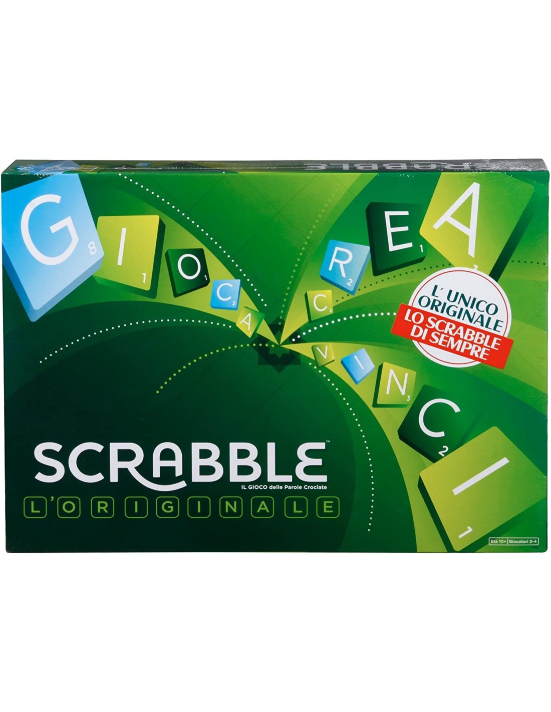 L'originale Scrabble in italiano è il gioco di parole famoso al mondo! Il motivo è semplice: Scrabble è facile da imparare, adatto a tutti e stimola le tue doti di ragionamento, creatività e problem-solving! a) “Pesca bene le tue lettere anzichè “Scegliete le vostre lettere. Poi scrivere “In ogni confezione di Scrabble trovi un sacchetto per nascondere le tessere-lettera. All'inizio del gioco ogni giocatore pesca sette lettere a caso dal sacchetto e le posiziona sul proprio porta-lettere. Ora inizia la sfida: componi la miglior parola possibile usando le lettere che hai a disposizione per ottenere il maggior numero di punti ogni turno! b) “Usa la tua astuzia per comporre la parola migliore anzichè “Componete le parole per fare punti. Poi scrivere “Ogni lettera ha un suo valore, che poi determina il punteggio della parola che formi sul tabellone. Ma attento, se sfrutti bene le caselle speciali posizionandoci sopra le lettere guadagni preziosi punti bonus! c) “Allena la mente e migliora il tuo vocabolario anzichè “Arricchite il vostro vocabolario. Poi scrivere “Scrabble è molto più di un gioco: infatti tiene allenata la mente e rafforza le tue doti strategiche. Inoltre, migliora il tuo vocabolario perchè ogni volta ti spinge a cercare parole nuove per totalizzare sempre più punti! nessuno -Scrabble l'originale: il tuo gioco delle parole crociate italiane -Usa tutta la tua astuzia per piazzare le tessere-lettera sul tabellone e comporre le migliori parole -Sfrutta le caselle speciali per guadagnare punti bonus -Scrabble allena la mente e migliora il tuo vocabolario -Da 2 a 4 giocatori Scrabble l'originale: il tuo gioco delle parole crociate italiane Usa tutta la tua astuzia per piazzare le tessere-lettera sul tabellone e comporre le migliori parole Sfrutta le caselle speciali per guadagnare punti bonus Scrabble allena la mente e migliora il tuo vocabolario Da 2 a 4 giocatori
