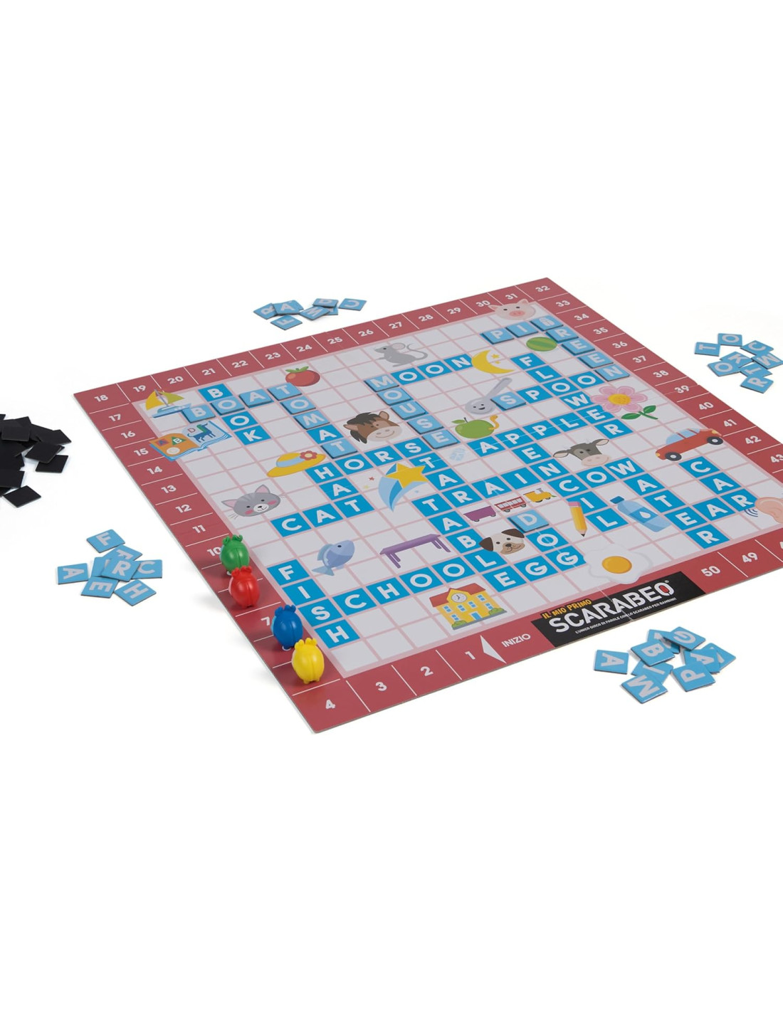 CONTENUTO DEL GIOCO IN SCATOLA: 1 plancia di gioco stampata fronte e retro, 144 tessere raffiguranti le lettere dell'alfabeto, 4 segnalini 3D a forma di Scarabeo, 1 regolamento