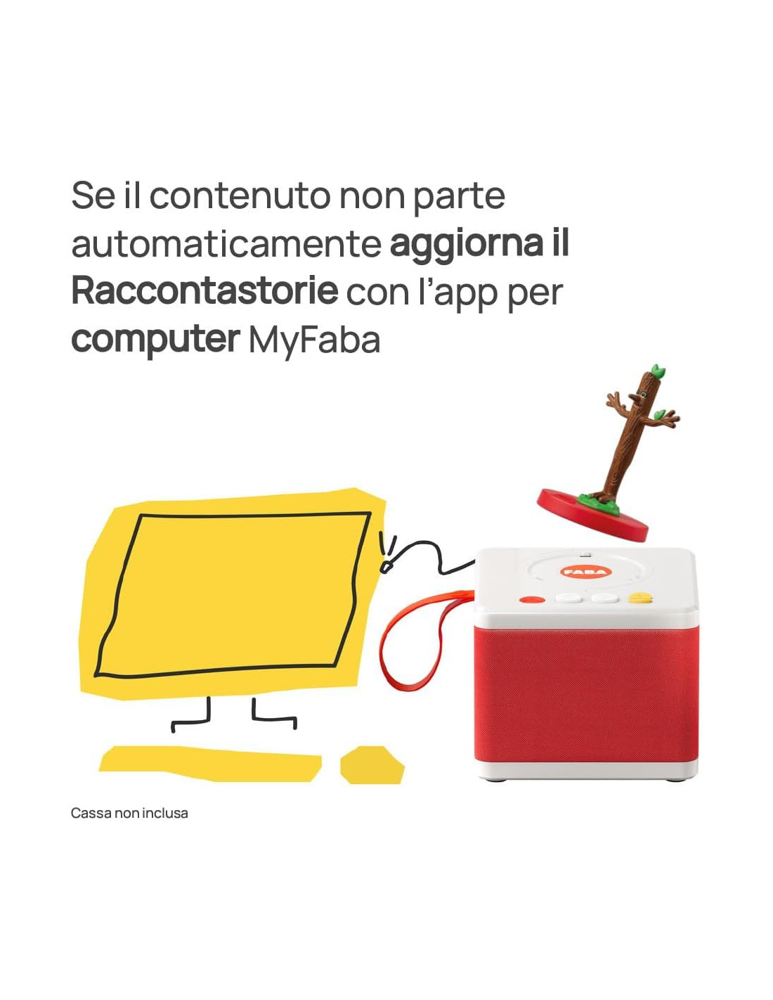 COMPATIBILITA': compatibile con entrambi i Raccontastorie FABA. Il Raccontastorie non è incluso. Per ascoltare il contenuto, se hai FABA Raccontastorie aggiornalo con l'app per computer MyFaba, se hai FABA+ connettiti al Wi-Fi