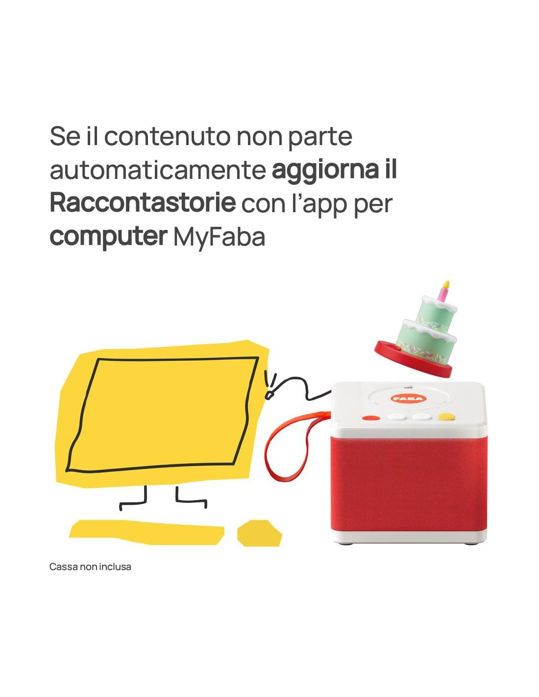 BUON COMPLEANNO!: Tante canzoni divertenti, perfette per regalare a bambini e bambine un buon compleanno con tutta la famiglia e gli amici! Contiene 15 canzoni tra cui: Tanti auguri a te, Buon compleanno, Strega comanda color, Un poco di zucchero. COMPATIBILITA': compatibile con entrambi i Raccontastorie FABA. Il Raccontastorie non è incluso. Per ascoltare il contenuto, se hai FABA Raccontastorie aggiornalo con l'app per computer MyFaba, se hai FABA+ connettiti al Wi-Fi