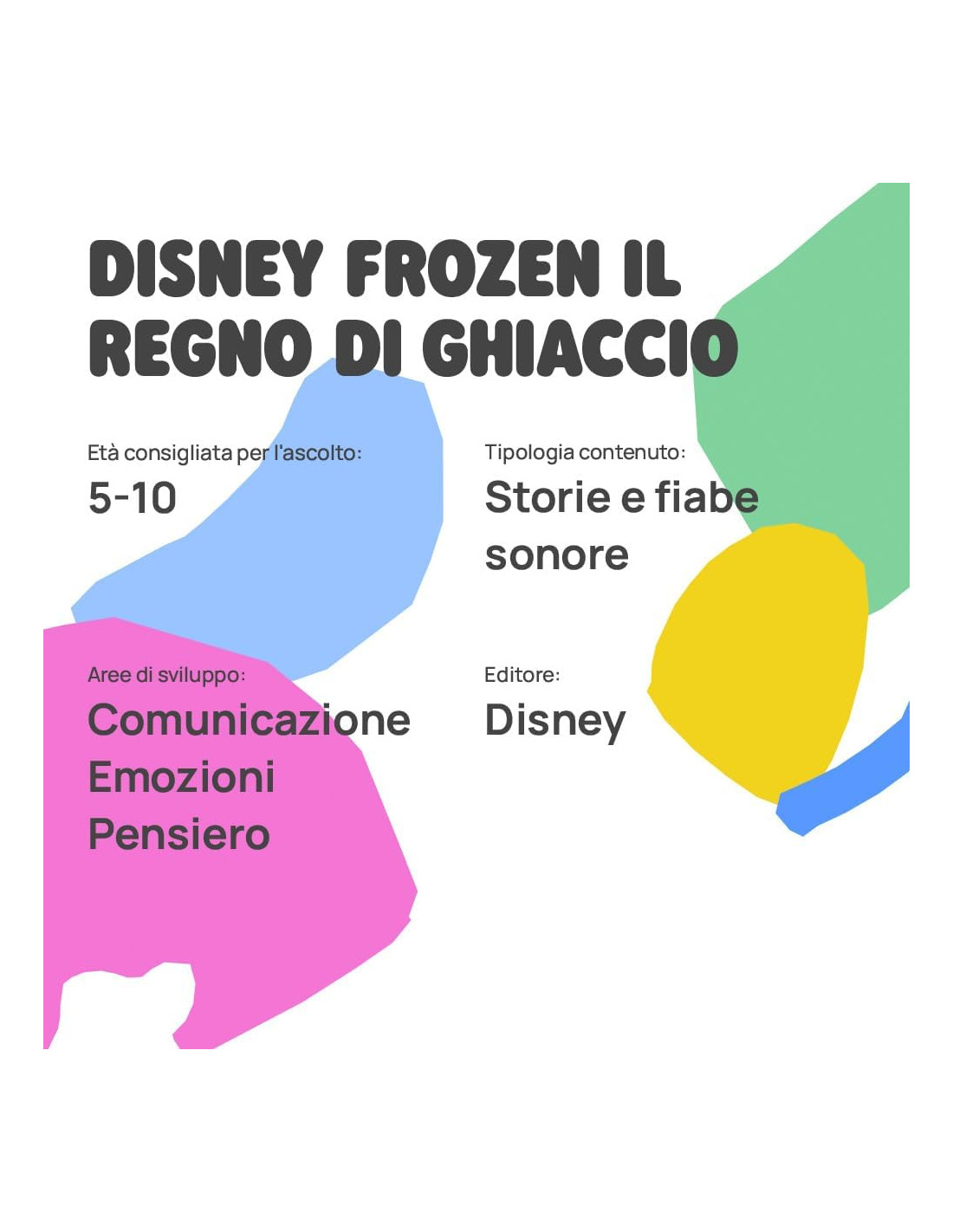 DISNEY FROZEN IL REGNO DI GHIACCIO: La storia sonora tratta da Frozen, il film d'animazione Disney. Una coinvolgente narrazione monovoce, arricchita da musiche ed effetti sonori, per esplorare il legame tra sorelle e la forza dell'affetto sincero. Dopo che la regina Elsa ha perso il controllo dei suoi poteri di ghiaccio, un eterno inverno ha avvolto il regno di Arendelle. In compagnia di un curioso gruppo di avventurieri, però, la principessa Anna è pronta a tutto pur di salvare il regno e riportare l'estate.