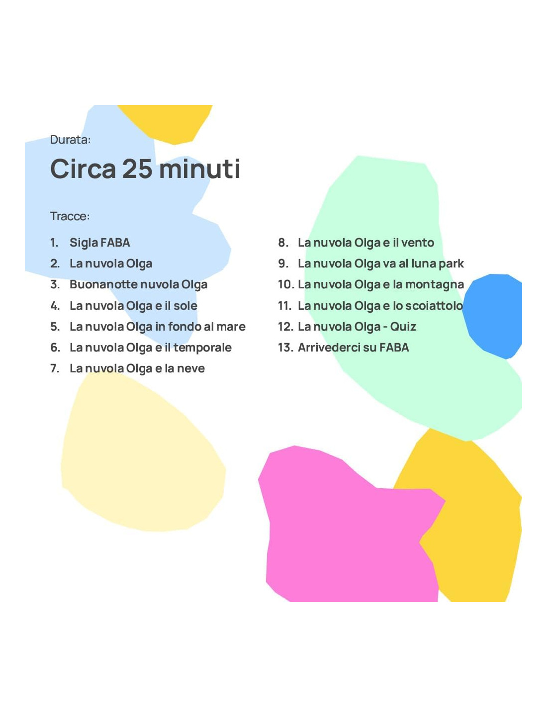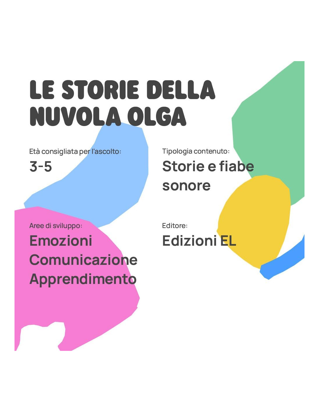 LE STORIE DI NUVOLA OLGA: Nuvola Olga e i suoi amici sono i protagonisti di dieci divertenti avventure sonore tratte dai libri di Nicoletta Costa. Al suo interno: La nuvola Olga, Buonanotte nuvola Olga, La nuvola Olga e il sole, La nuvola Olga in fondo al mare, La nuvola Olga e il temporale, La nuvola Olga e la neve, La nuvola Olga e il vento, La nuvola Olga va al luna park, La nuvola Olga e la montagna, La nuvola Olga e lo scoiattolo.