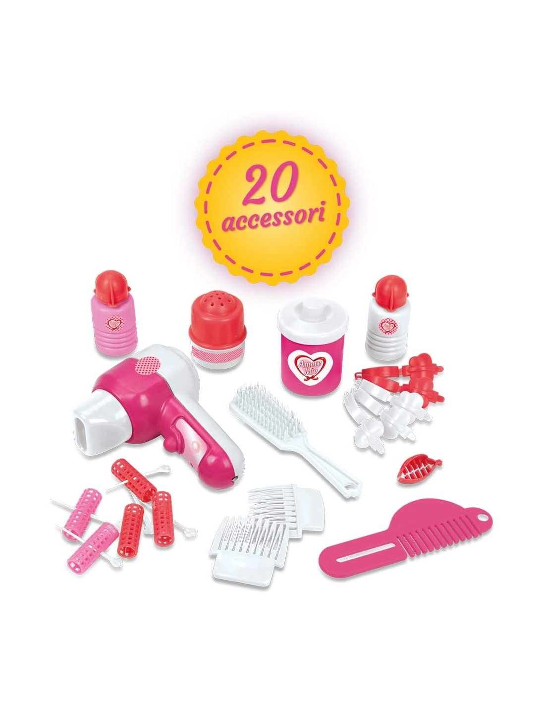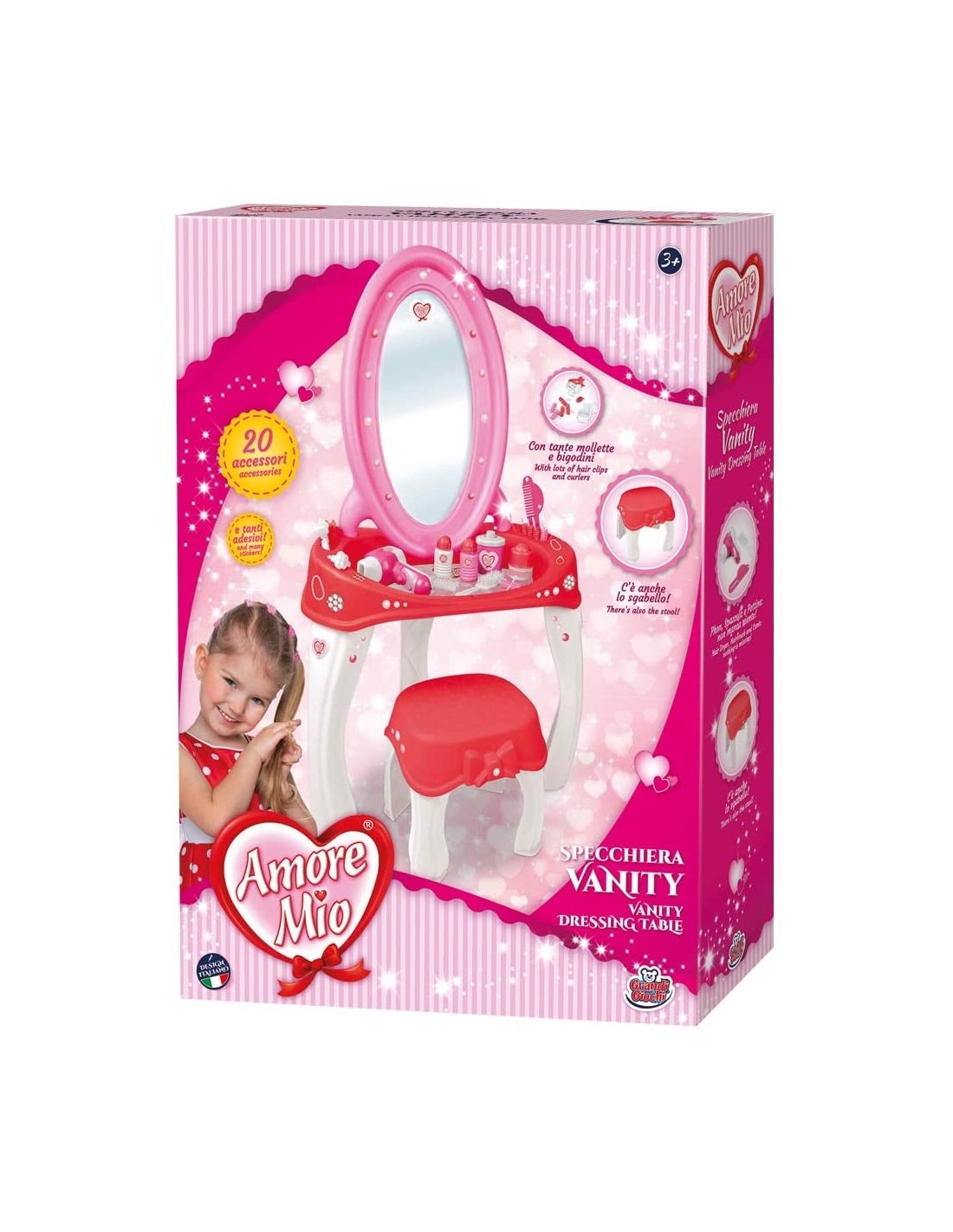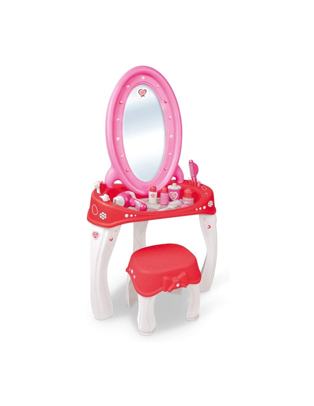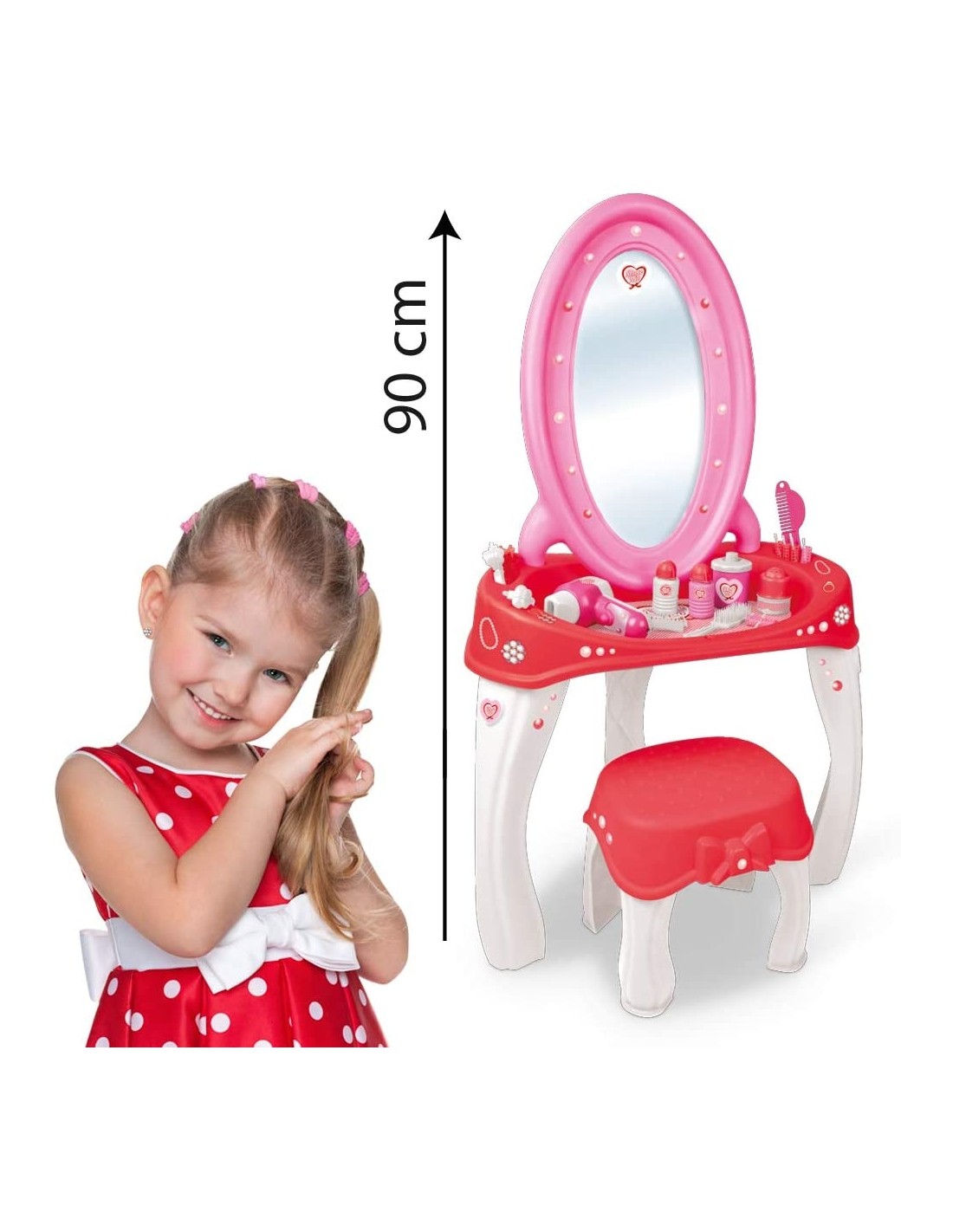 Bellissima specchiera tutto rosa, bianca e rossa per le bambine che amano farsi belle e avere sempre acconciature perfette Phon, zzola e pettine: non manca niente tanti altri accessori, 20 totali inclusi. 100% made in italy Specchiera alta ben 90cm con comodo sgabello e 20 esclusivi accessori Con tante mollette e bigodini per incredibili acconciature Le bambine potranno ritagliare dalla confezione la tovaglietta per decorare la specchiera
