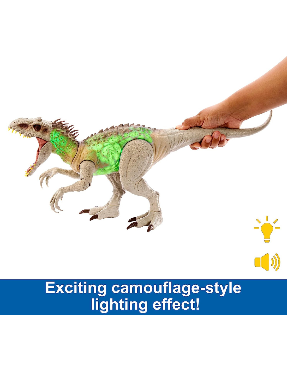 Camouflage 'N Battle! Questa statuetta Jurassic World Indominus Rex ha un effetto luminoso mimetico unico che si muove lungo il suo corpo e accentua il design della giungla. Questa funzione attivata a pulsante ha anche un suono vibrante Un chomp a collo largo. Un movimento chompende è controllato dal pulsante sulla coda dell'Indominus Rex. Ottima idea regalo. Con funzioni sonore, illuminazione e movimento, questo giocattolo dinosauro lungo 53,3 cm è un regalo emozionante per i fan di Jurassic World dai 4 anni in su. Gioco connesso. Scansiona il codice di tracciamento nascosto del dinosauro nell'app gratuita Jurassic World Facts con un dispositivo intelligente compatibile (non incluso) per avviare attività e giochi di realtà aumentata. Divertente. I bambini possono esplorare le modalità di calore e raggi X e giocare a giochi di dinosauri come la Missione Rescue 'N Release e la Challenge Track 'N Catch