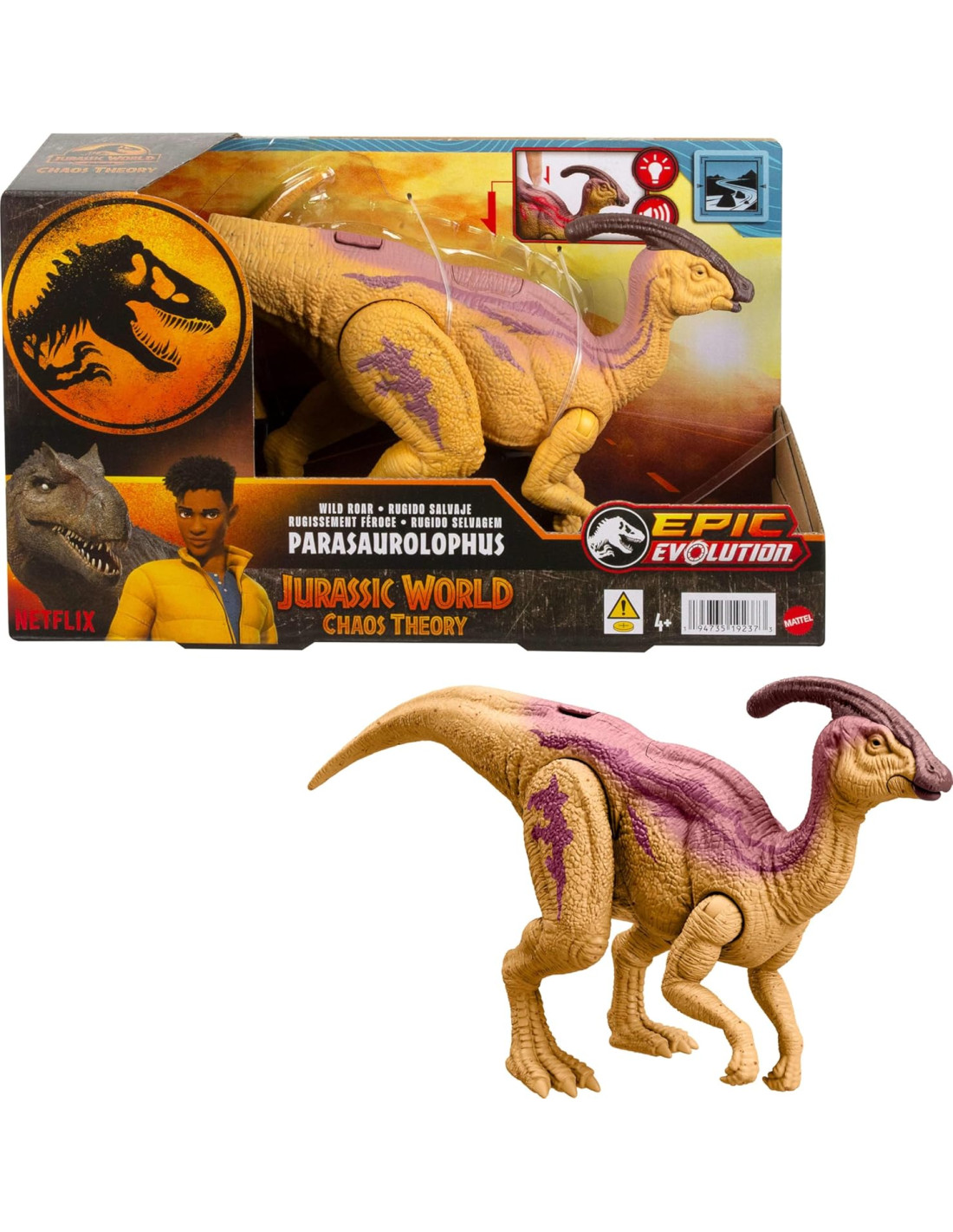 Mattel Jurassic World: Teoria del Caos Netflix - Parasaurolofo Ruggito Selvaggio, dinosauro con luci e suoni, ruggito e dorso con effetto bioluminescente attivabile con un tasto, 4+ anni, Viola, HTK75