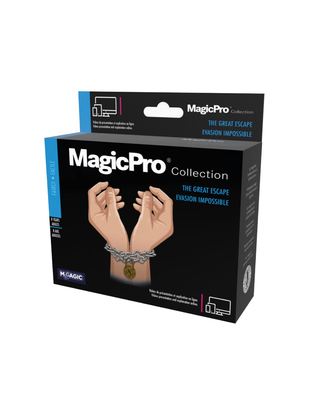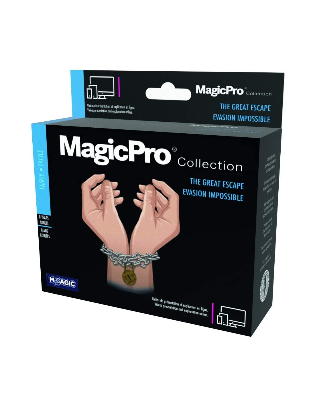Uno spettatore fissa accuratamente i polsi del mago con una catena metallica ed un lucchetto. Il mago tuttavia conosce un fantastico segreto che gli consente di liberarsi in una frazione di secondo. Uno dei più famosi trucchi di evasione conosciuti oggi! Età: 8+
