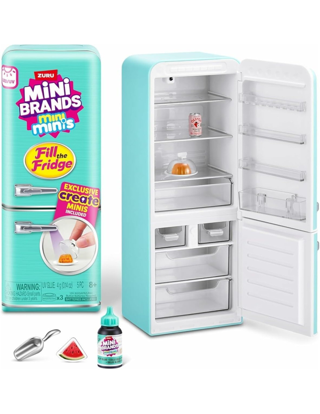 Il playset "Fill the Fridge" di Mini Brands include un mini frigorifero con luce UV funzionante, magneti e una selezione di mini capsule da collezione a sorpresa.