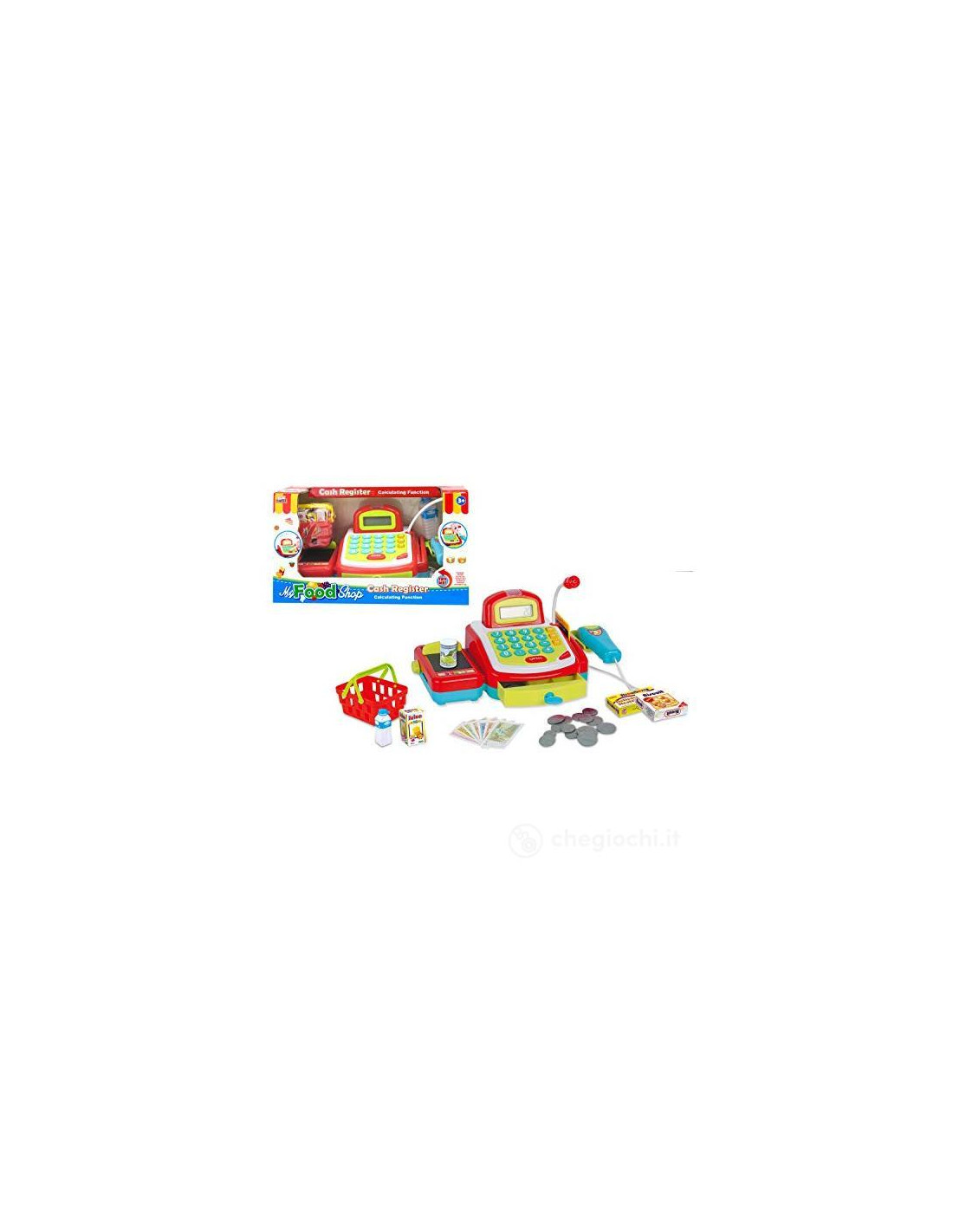 Una bella e divertente cassa come quella del supermercato con tanti accessori per fare la spesa. I bambini potranno fare la spesa poi andare in cassa e scannerizzare, uno ad uno, tutti i prodotti.