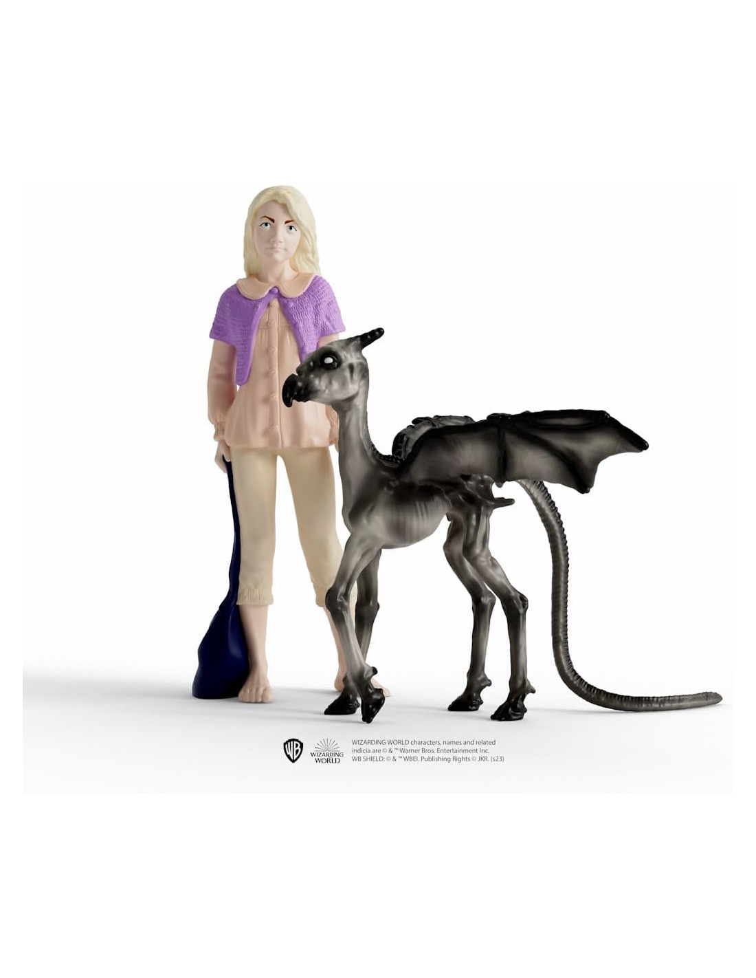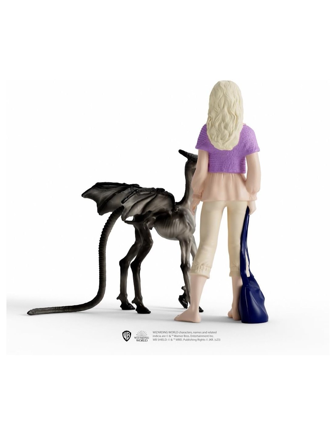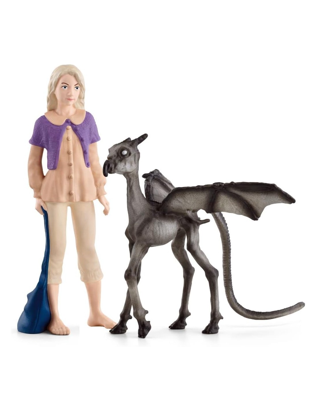Accanto a lei c'è una creatura magica: un piccolo thestral con le ali spiegate. Questo set di due personaggi di Schleich fa parte della serie Wizarding World, che include personaggi del mondo di Harry Potter.
