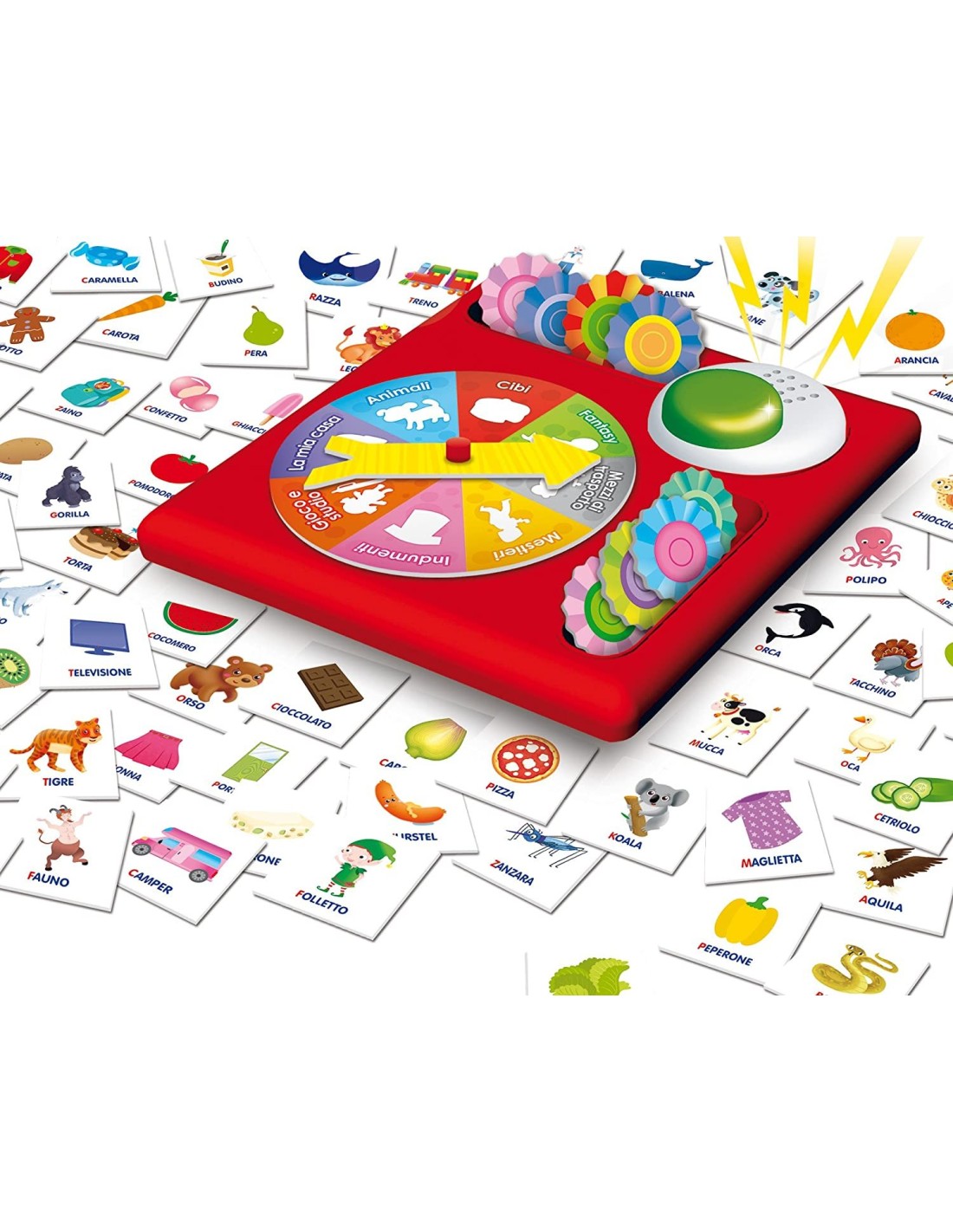 Un originalissimo gioco di attenzione e memoria e una vera e propria gara di prontezza per i più piccoli: i bambini devono cercare le tesserine della categoria estratta, osservandole sul piano di gioco. Vince chi ne trova di più! Non adatto a bambini di età inferiore a 3 anni. Da usare sotto la sorveglianza di un adulto Contenuto della confezione Consolle in plastica - Timer elettronico - 4 spinner - 200 cartine - 20 coccardine - Istruzioni -Un originale gioco di attenzione e memoria -Gioco originale e innovativo - 4 modalità di gioco - Impara tante parole -Memoria - Concentrazione - Parole - Manualità fine - Logica Un originale gioco di attenzione e memoria Gioco originale e innovativo - 4 modalità di gioco - Impara tante parole Memoria - Concentrazione - Parole - Manualità fine - Logica