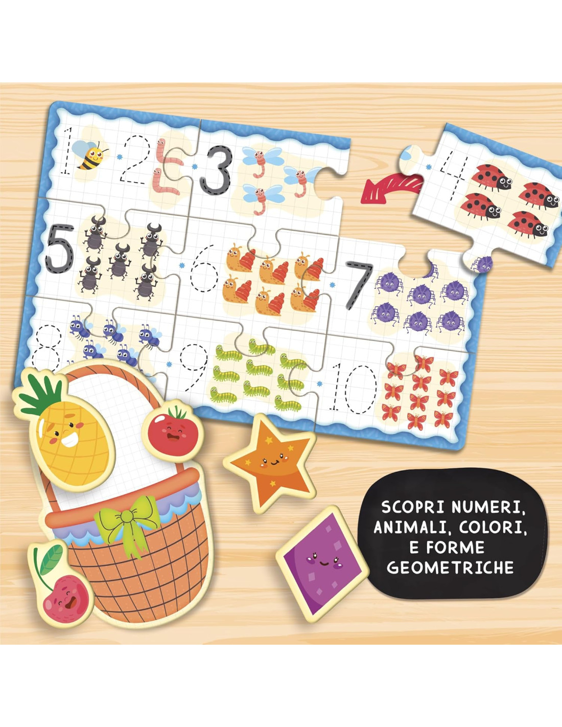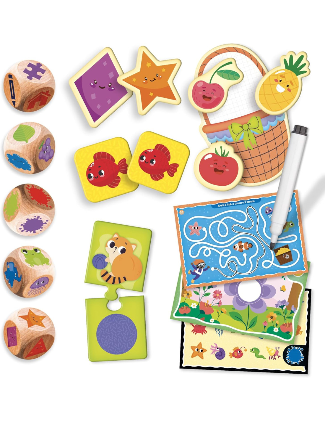 Impara a scrivere - Esercita logica e memoria 5 dadi in legno - Penna scrivi e cancella - Cancellino - Puzzle - Schede attività - Istruzioni
