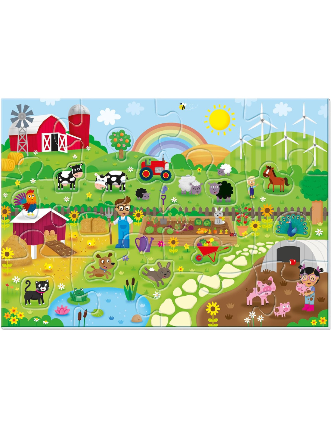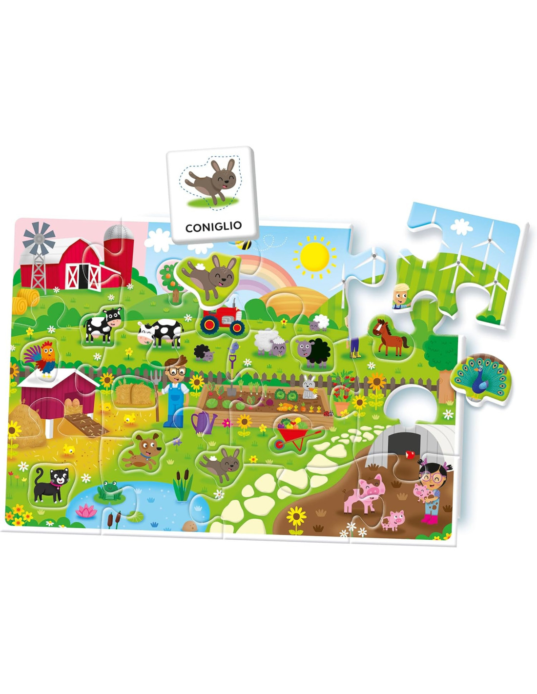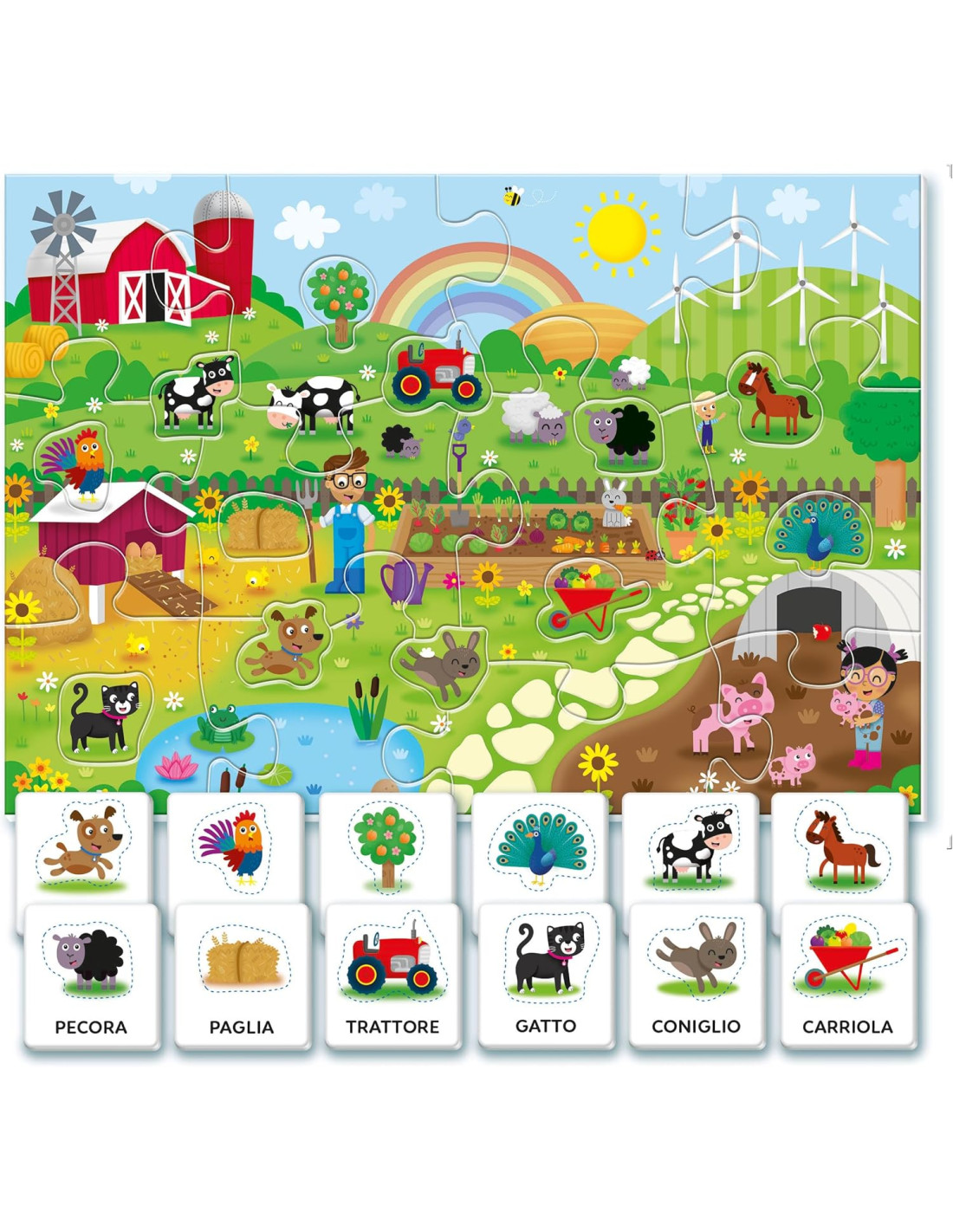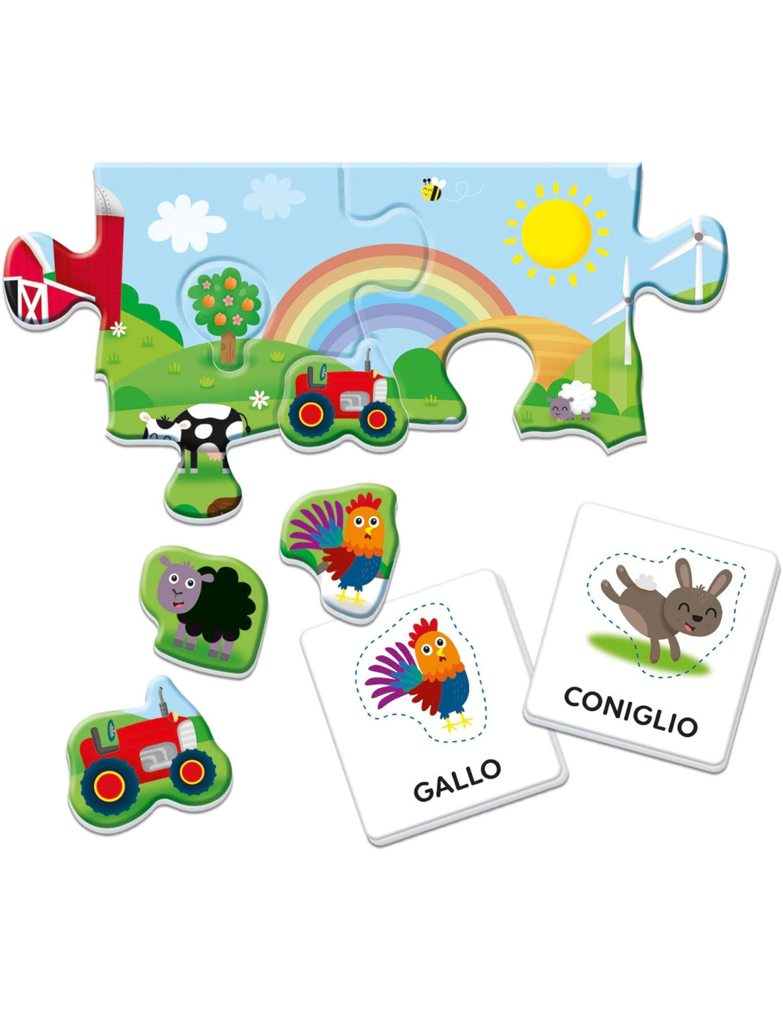 Un colorato puzzle dai grandi pezzi adatto ai bambini più piccoli per scoprire il mondo degli animali. Oltre ai grandi pezzi da incastrare, il puzzle contiene anche gli animali della fattoria sagomati. Gli stessi animali possono essere sovrapposti alle sagome stampate sulle carte "nomenclatura", dove viene presentato il loro nome. Gli animali sagomati inoltre hanno una superficie a rilievo che invita il bambino all'esplorazione tattile. Così il bambino, fin dai primi anni, sviluppa la manualità e il linguaggio.