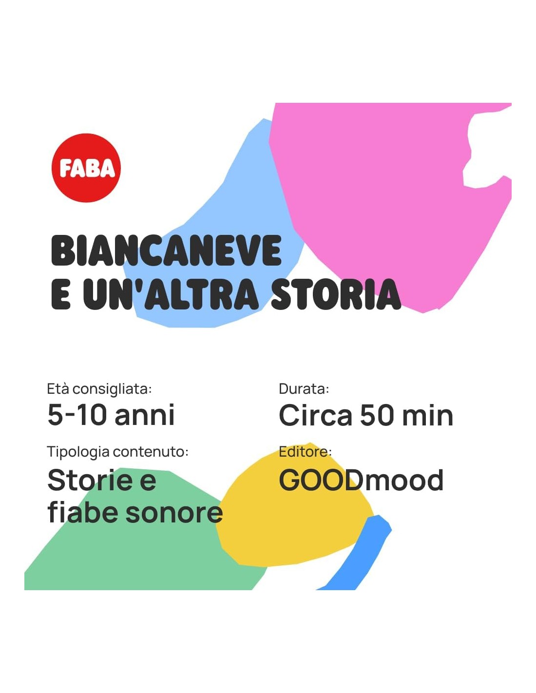 FABA- Personaggio Sonoro, Colore, Biancaneve. Contiene una rivisitazione della fiaba classica, un racconto inedito e due divertenti canzoni. Alla fine alcune domande per una migliore comprensione del testo.