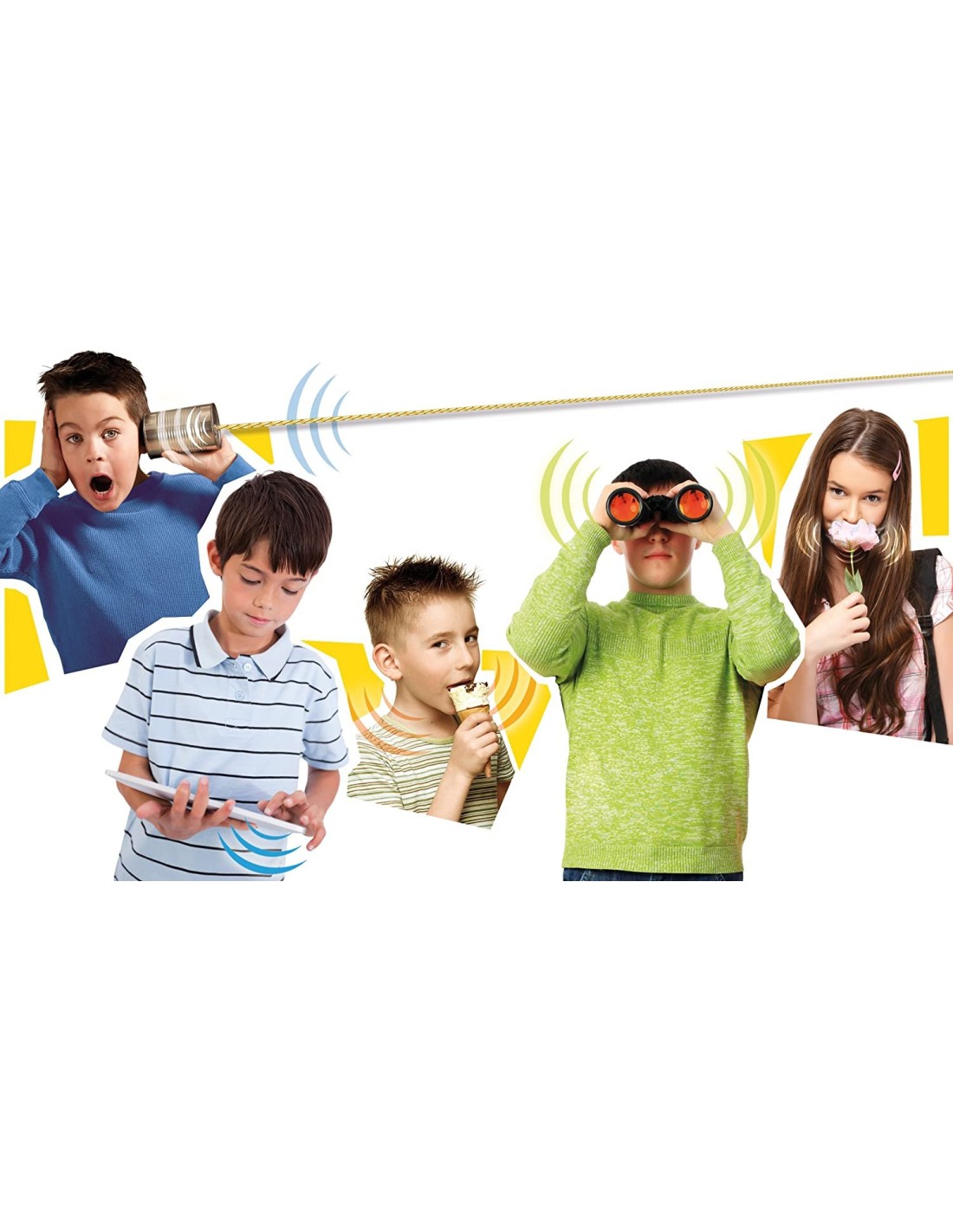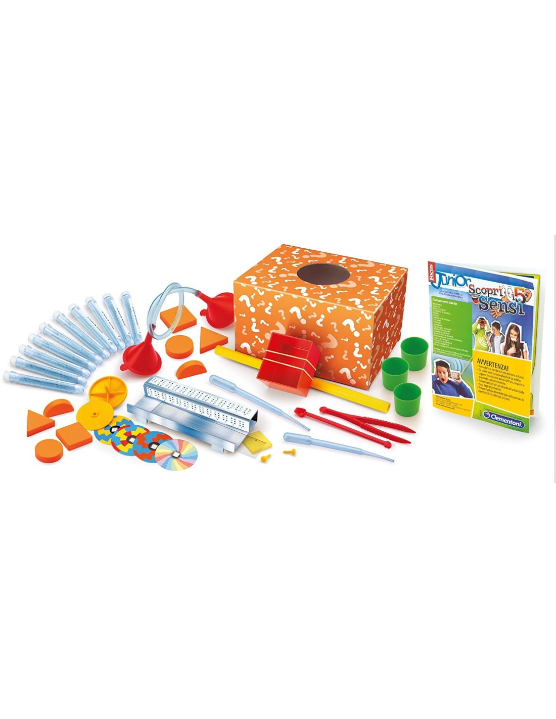 Un kit ricco di componenti per esperimenti che coinvolgeranno vista, udito, olfatto, gusto e tatto.