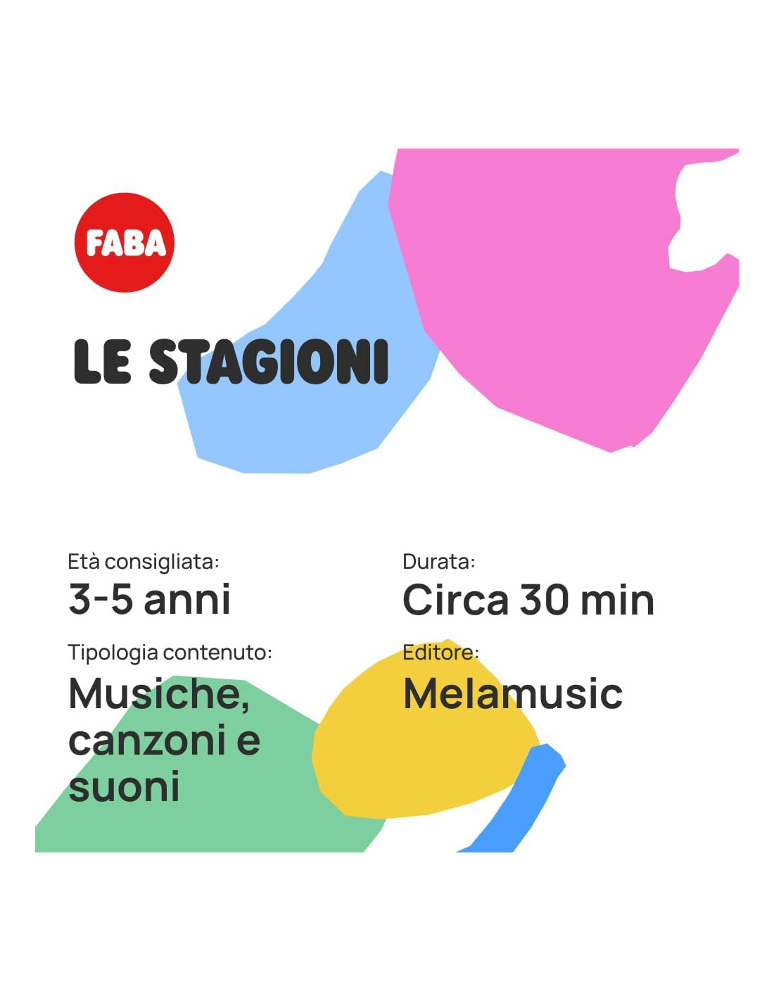 CONTENUTO: 1. Coloriamo le Stagioni 02:07, 2. È primavera 02:44, 3. Fata primavera 02:19, 4. Filastrocca delle stagioni 02:22, 5. I mesi speciali 02:54, 6. Il tango dell'autunno 01:45, 7. Le stagioni dell'orto 02:10, 8. L'estate dei mille colori 01:57, 9. L'inverno incantato 01:29, 10.Mago autunno 01:46, 11. Natale con i fiocchi 02:26, 12.Primavera in campagna 02:51, 13. Tutti in vacanza 02:20, 14. Viva le stagioni 02:11.