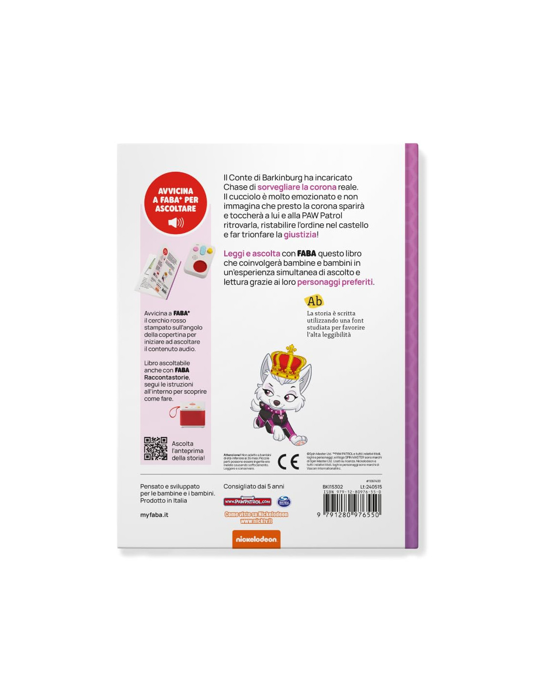 Il conte di Barkinburg ha incaricato Chase di sorvegliare la corona reale. È molto emozionato, non immagina che presto la corona sparirà e toccherà a lui e alla PAW Patrol ritrovarla, ristabilire l'ordine nel castello e far trionfare la giustizia! Leggi e ascolta con FABA questo libro che coinvolgerà bambine e bambini in un'esperienza simultanea di ascolto e lettura grazie ai loro personaggi preferiti.