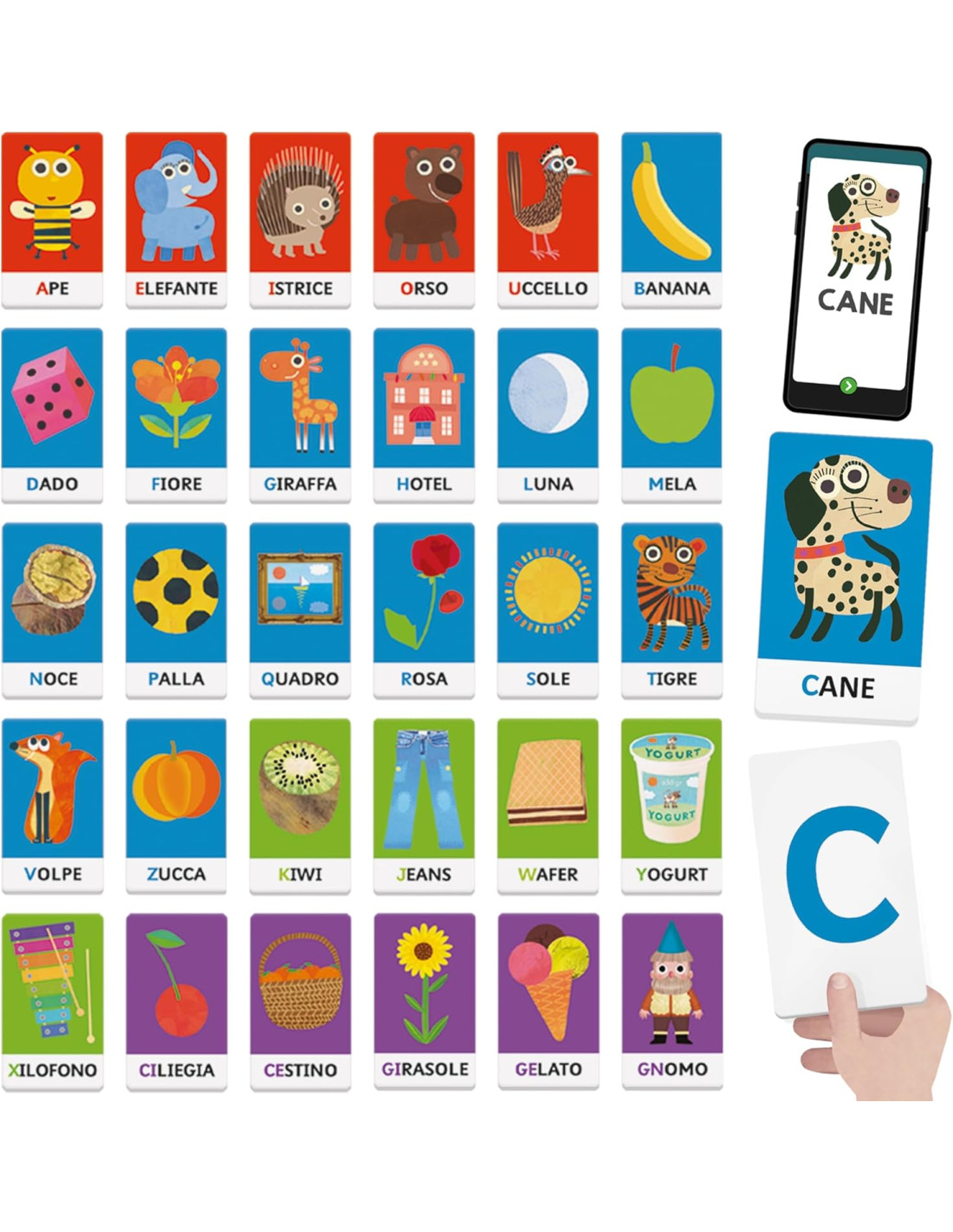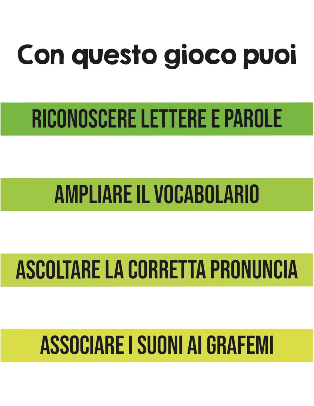 Con le speciali flashcards interattive i bambini imparano a pronunciare le parole in modo corretto, associano i suoni ai grafemi corrispondenti ampliando il lessico. In più, con l'app, ascoltano la pronuncia di lettere e parole, e interagiscono con le immagini.