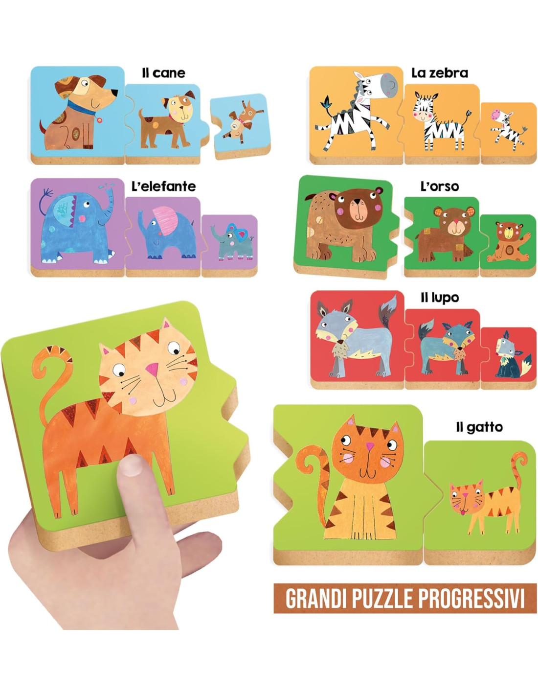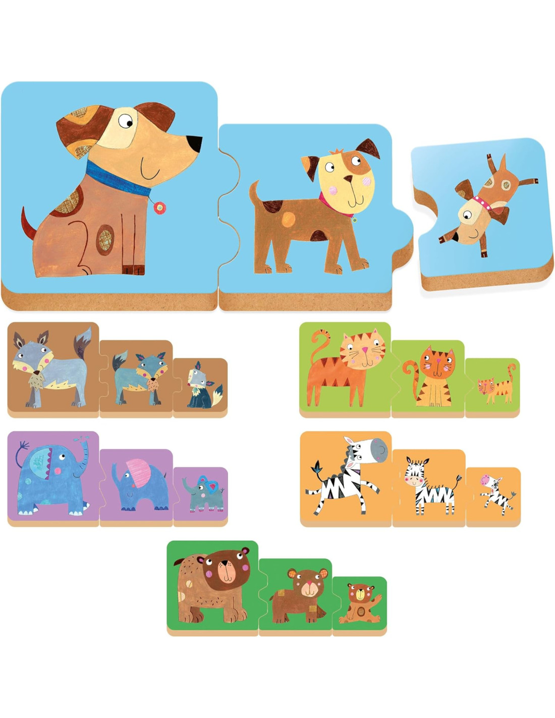 Qual è l'animale più grande? E quale quello più piccolo? Con gli speciali incastri didattici e i tasselli in robusto legno, i bambini piccoli allenano la logica e la manualità imparando a riconoscere gli animali e le loro famiglie.