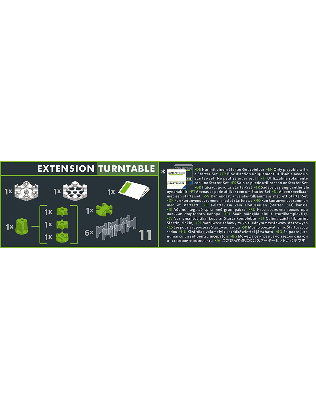 GraviTrax è un gioco di costruzione STEM con cui potrai liberare la tua creatività costruendo un fantastico mondo di percorsi Aggiungi alla tua pista l'accessorio Turntable di GraviTrax PRO e controlla ancora di più i cambi di direzione delle biglie! La rotazione di questo accessorio consentirà alla biglia di continuare il proprio percorso sullo stesso livello oppure su quello inferiore Questo blocco d'azione si gioca con almeno un Starter Set ed è compatibile con tutti gli elementi GraviTrax. Scopri tutte le estensioni e gli accessori per arricchire le tue piste Contiene: Manuale d'istruzioni illustrato, 1 blocco d'azione Turntable. Realizzato in Europa con materiali di alta qualità