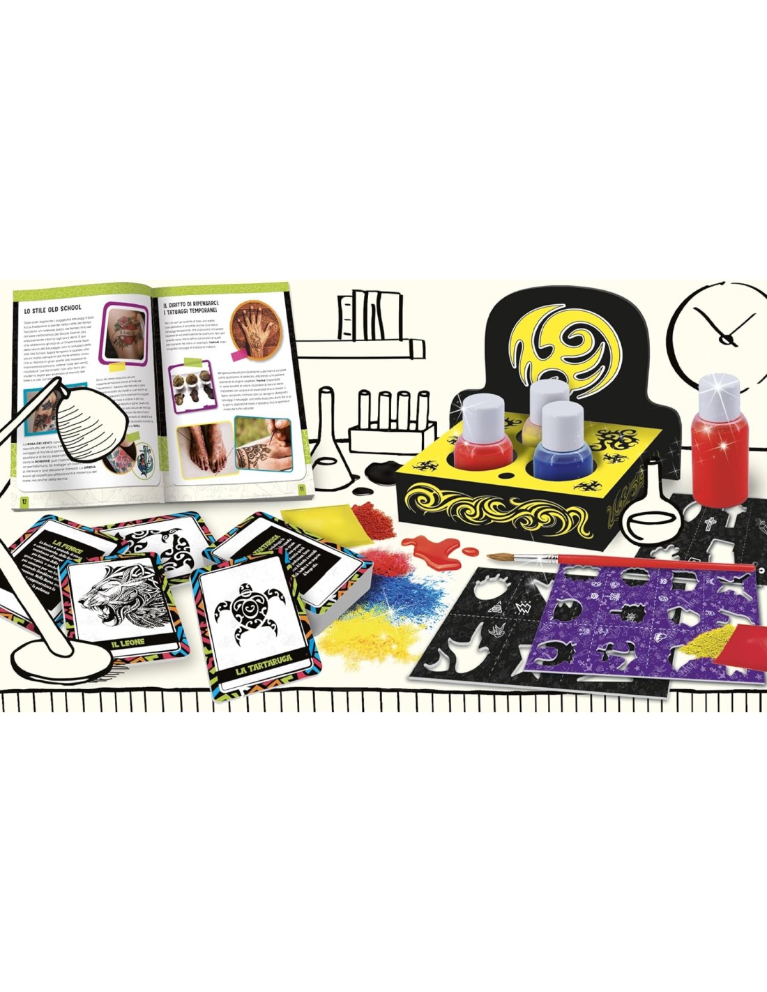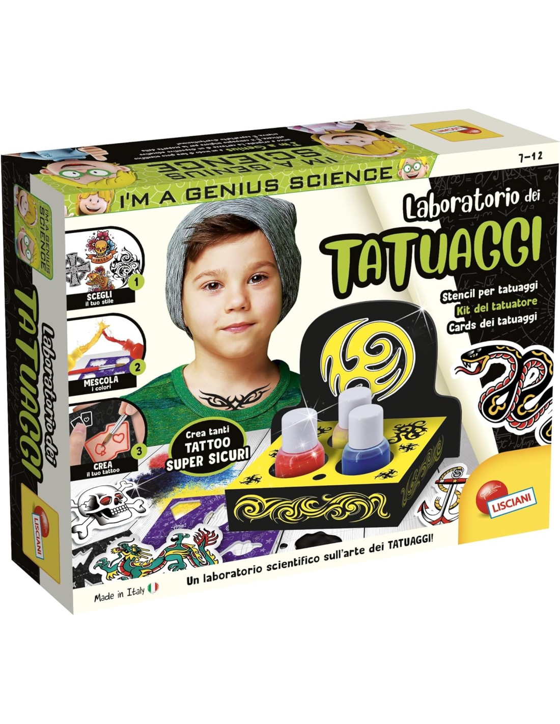 Il laboratorio per scoprire il mondo dei tatuaggi! Da sempre gli esseri umani sono andati in cerca di accessori e “trucchi” (in tutti i sensi) per modificare il proprio aspetto estetico allo scopo di distinguersi, creare una propria e originale identità o semplicemente per abbellirsi. Tra questi, il tatuaggio riveste un ruolo speciale, perchéè una specie di “marchio di fabbrica” senza moda e senza età, talmente personale da accompagnare chi lo ha scelto per sempre (o quasi). Con questo fantastico laboratorio puoi finalmente scoprire il grande mondo dei tattoo! Con 3 inchiostri super sicuri da realizzare per giocare e divertirsi in compagnia di I'm a Genius. All'interno tutto l'occorrente per diventare dei tatuatori provetti! Ingredienti per creare gli inchiostri Boccette Stencil Libretto illustrativo