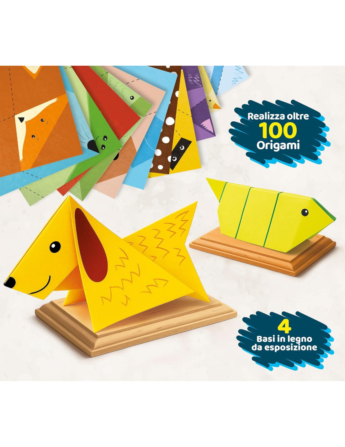 Un kit completo per scoprire l'arte dell'origami! Con 105 foglietti colorati e stampati, i bambini possono realizzare una varietà di creazioni origami, sviluppando abilità manuali e precisione. In aggiunta, 4 basette in legno permettono di esporre le creazioni più belle.