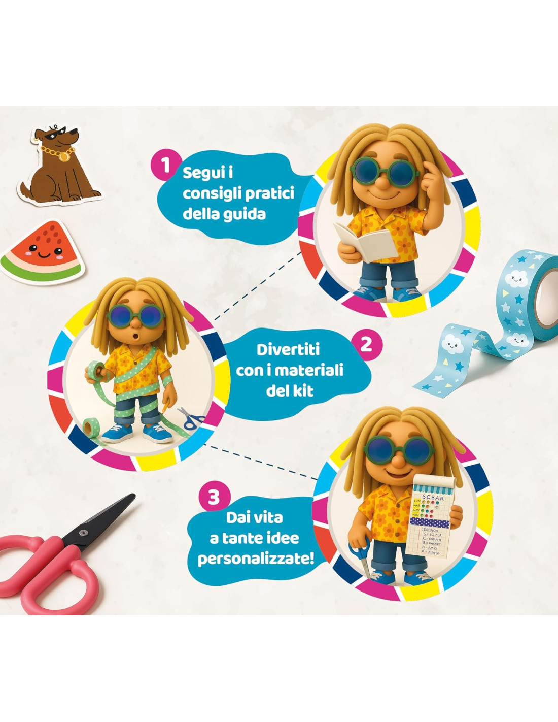 Crea oggetti di cartoleria con materiali colorati e tantissimi accessori! Tutte le attività creative che ti piacciono - Manuale illustrato - Kit da personalizzare - segnalibri- cartellina- stickers- natri adesivi decorati- gomma per cancellare- righello- forbici - colla- portapenne 3d in cartone- pennarelli glitter- pennarelli colorati- penna- evidenziatore- post it sagomati- manuale illustruto Manualità fine e coordinazione occhio-mano - Creativitià - Concentrazione - Forme e colori