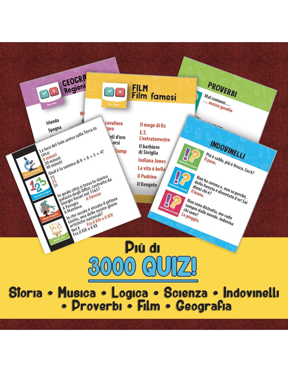 Nozioni di italiano, matematica, storia, geografia, animali e natura, fiabe, storie e fumetti, discipline sportive, scienza e tecnologia, arte e mestieri Più di 5000 quiz per una gara divertente e istruttiva Gioco educativo in scatola, con le divertentissime domande vero o falso Nozioni di italiano, matematica, storia, geografia, animali e natura, fiabe, storie e fumetti, discipline sportive, scienza e tecnologia, arte e mestieri