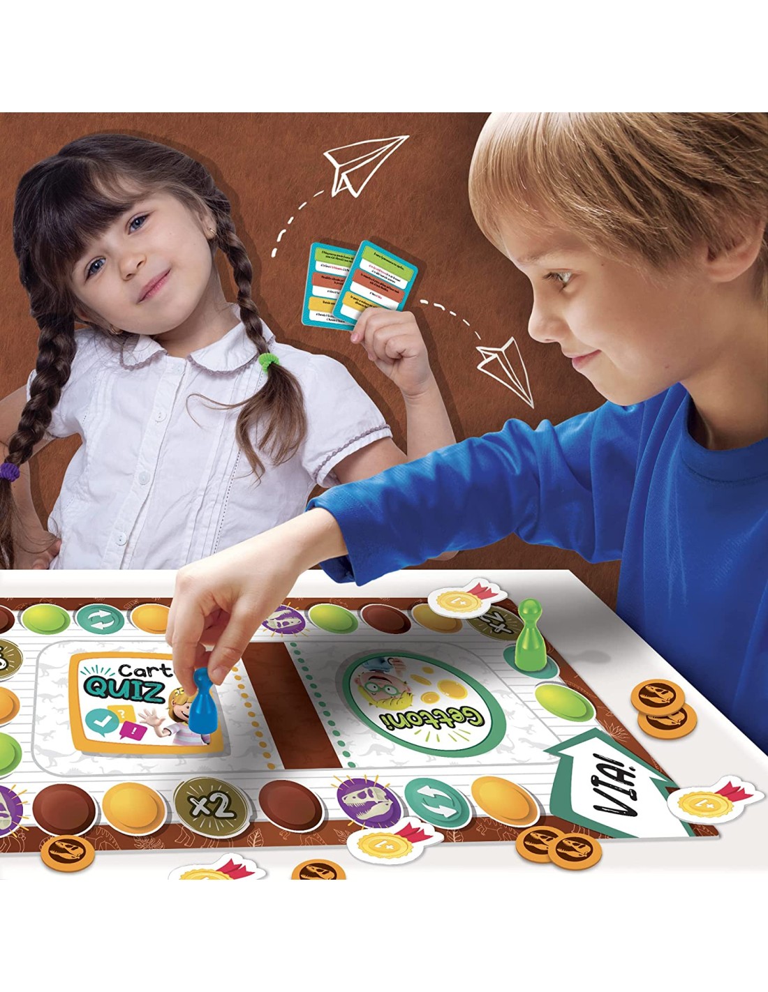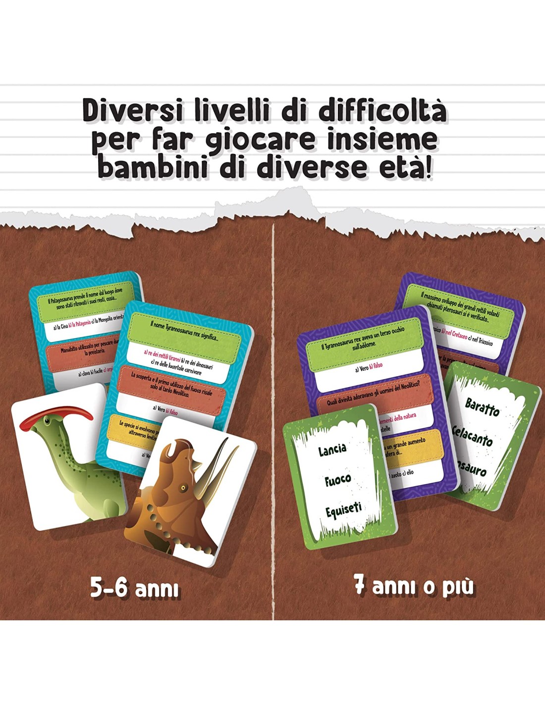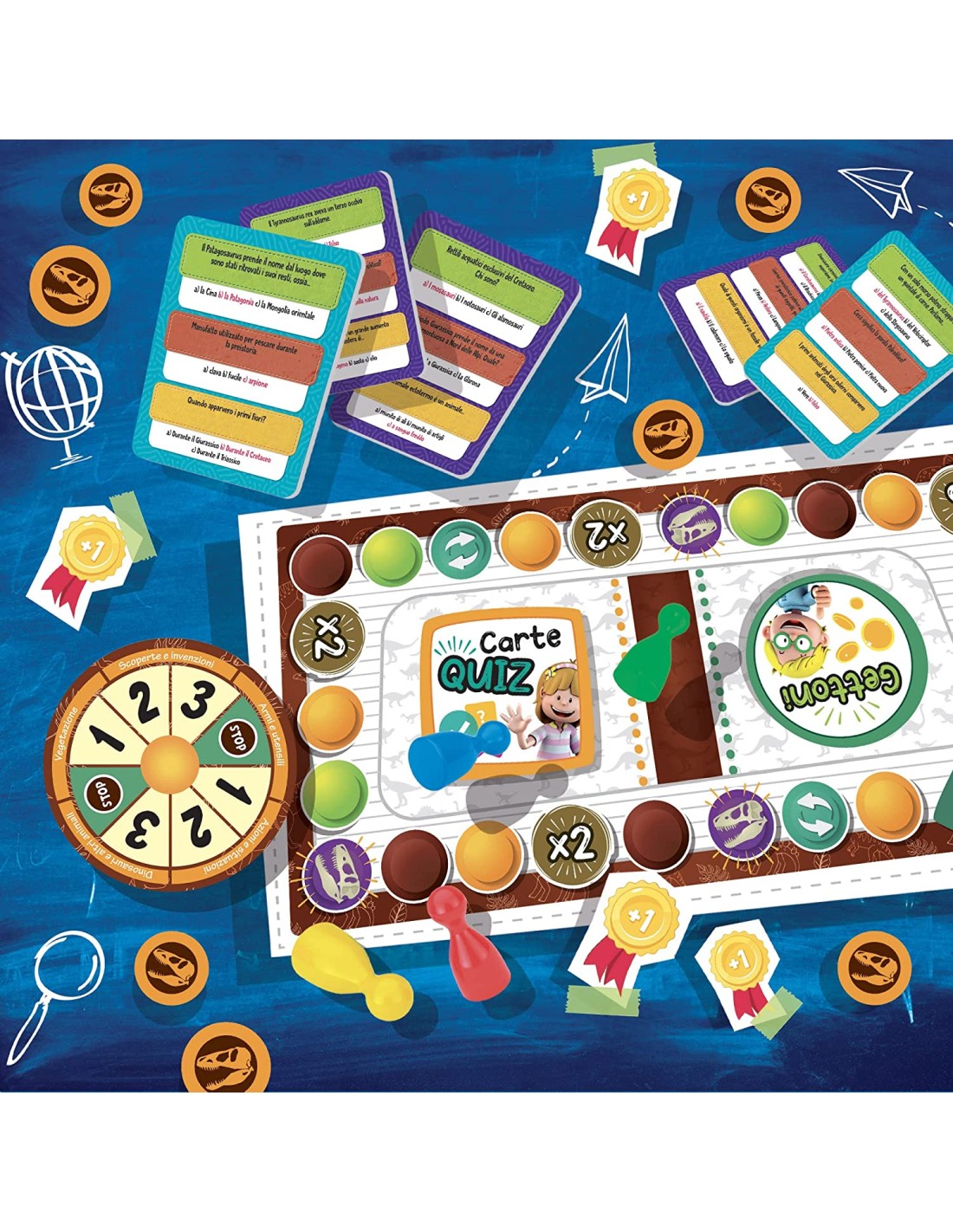 Una grande avventura a quiz nel mondo preistorico 2, 4 giocatori, Basato sui programmi ministeriali, 3 livelli di difficoltà, Giocano grandi e piccoli insieme, Tanti quiz stimolanti, Scopri tantissime specie di dinosauri, L'evoluzione umana, Gli ominidi, Coccardine premianti Gioco educativo in scatola, 1 plancia di gioco, 1 spinner, 16 gettoni tondi, 12 coccarde, 27 carte speciali, 4 birilotti, 48 carte quiz, Istruzioni Nozioni di preistoria, Pensiero logico, Autonomia e rispetto delle regole, Rapporto con gli altri