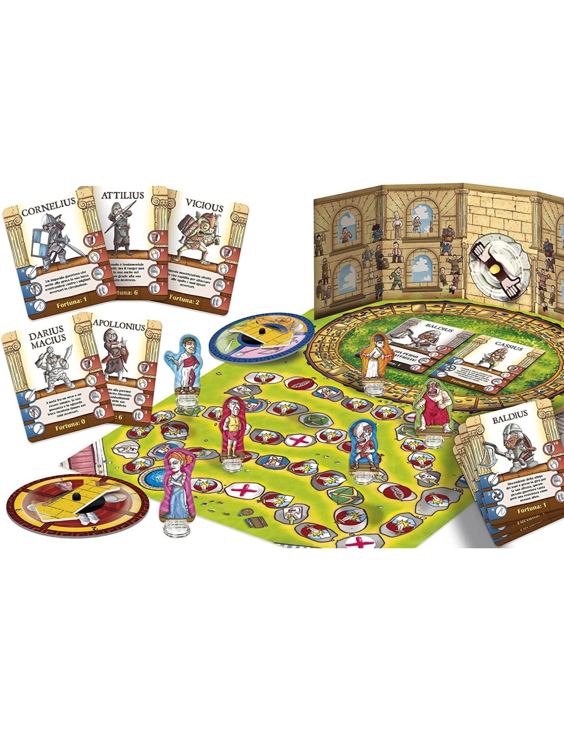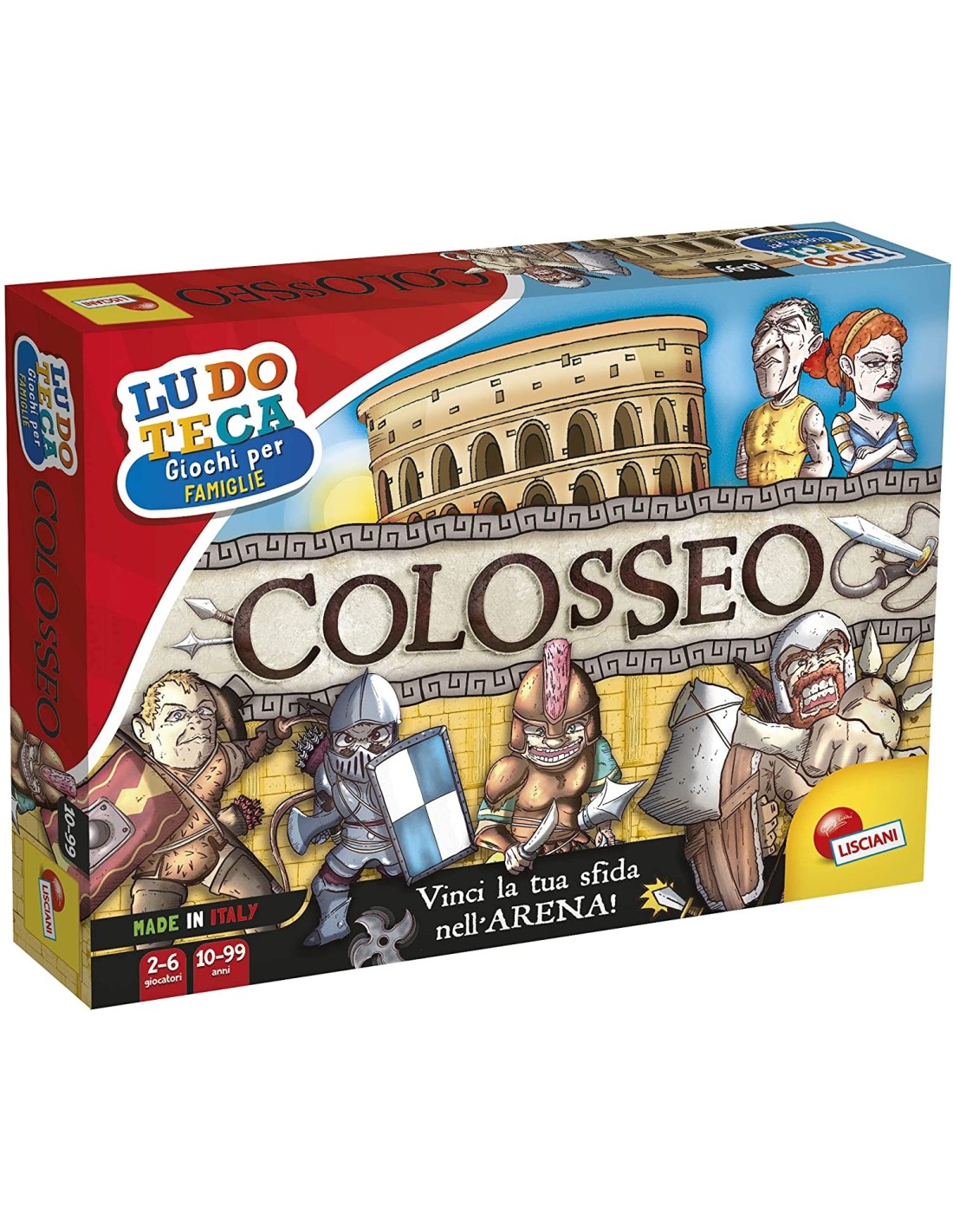 Contenuto: Tabellone, Colosseo 3D, carte dei gladiatori, 3 spinner, segnaposto con card stand, istruzioni Autonomia; logica; memoria; Made in Italy