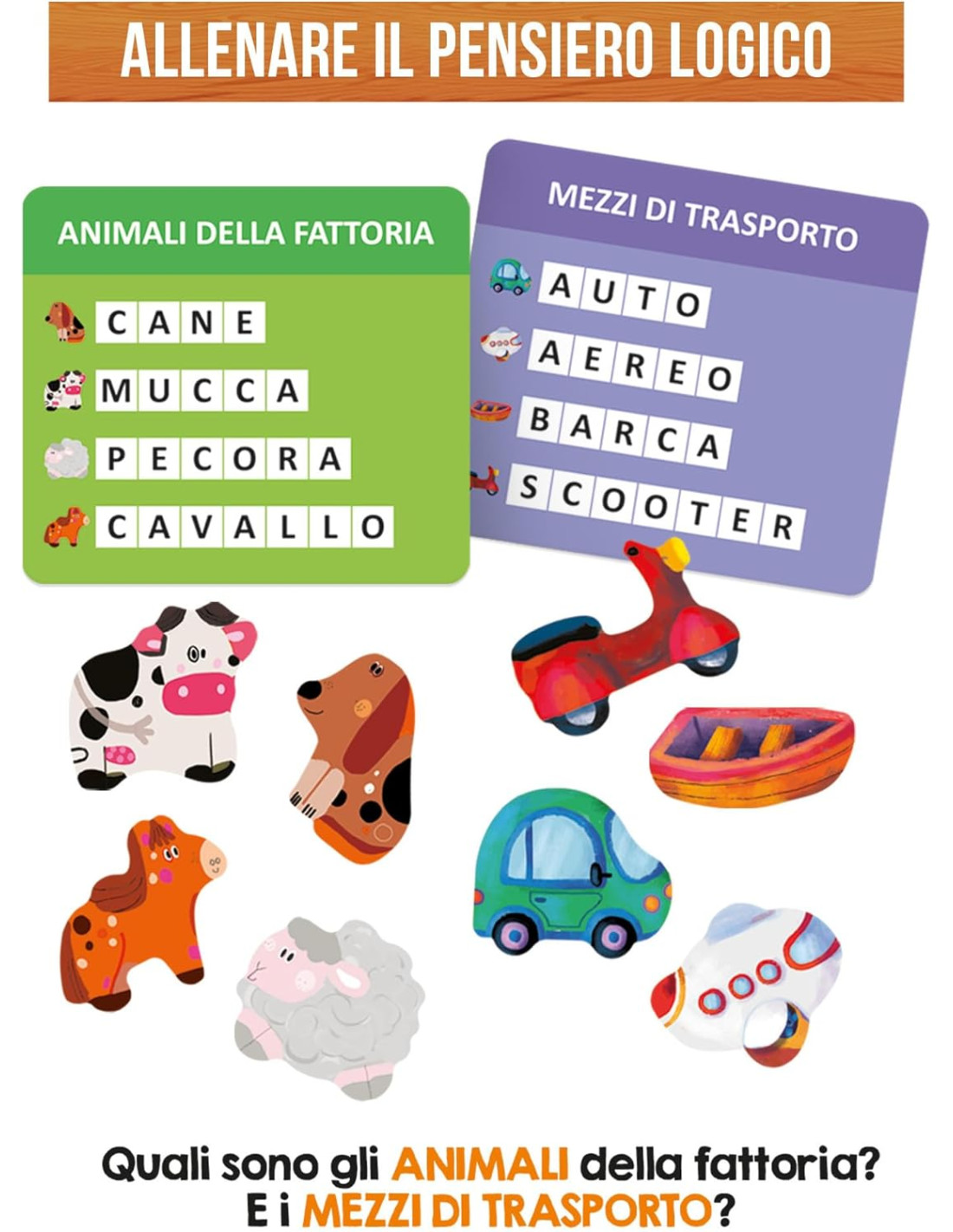 OTTIMI CONTENUTI per giocare in più modi e divertirsi imparando: 1 lavagna magnetica in legno; 9 forme geometriche; 6 cartine lessicali; 24 soggetti sagomati; 48 lettere mobili; 1 pennarello cancellabile.