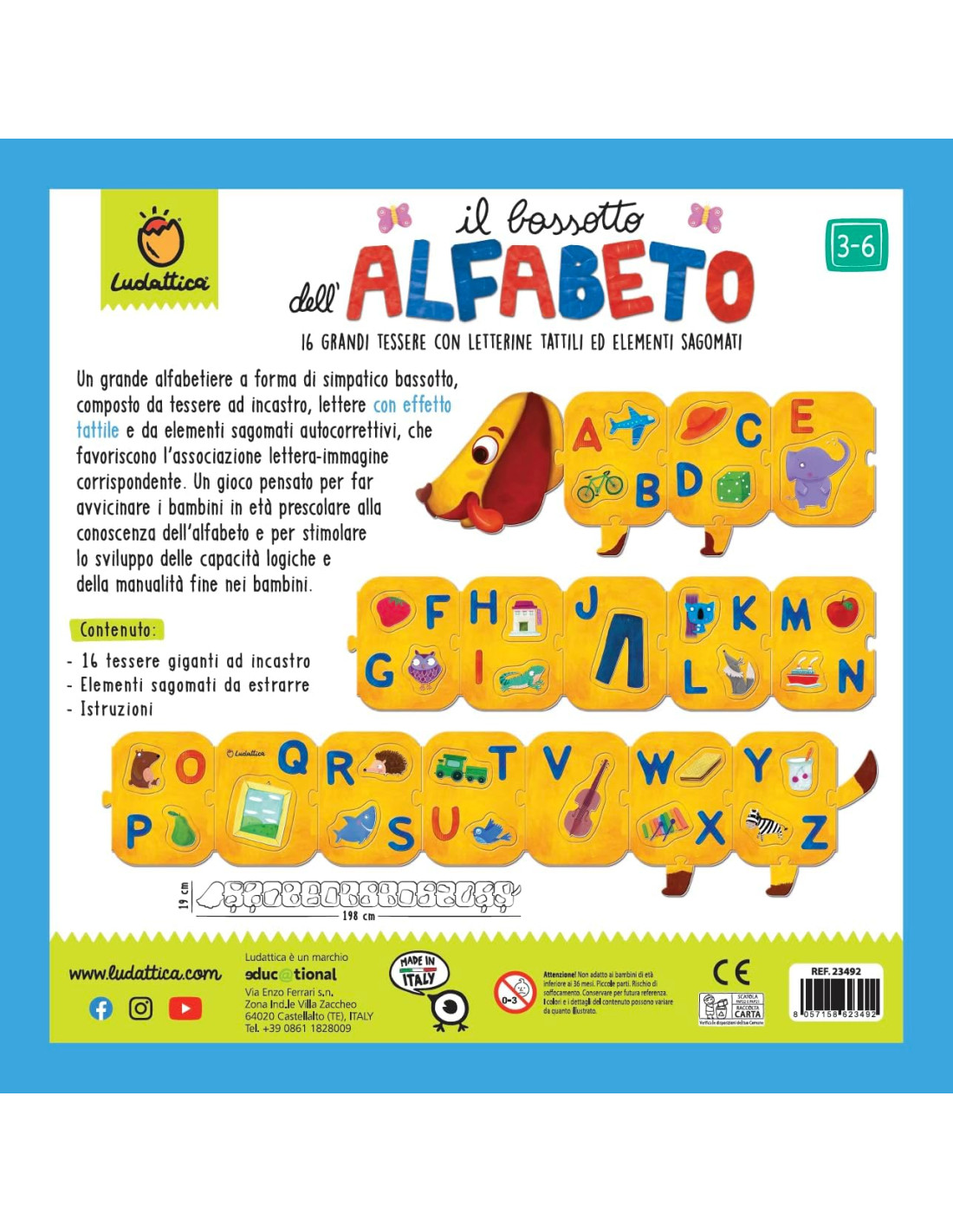 Un bassotto alfabetiere componibile lungo quasi 2 metri! Lettere con finitura tattile ruvida al tatto 26 elementi sagomati estraibili Un gioco per imparare l'alfabeto in maniera semplice e divertente Gioco educativo per bambini a partire dai 3 anni Tessere in cartone spesso e resistente per un prodotto di alta qualità Made in Italy