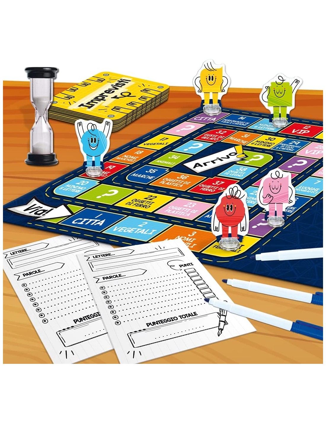 Linguistica; Made in Italy Contenuto: Tabellone, spinner, clessidra, cartelle scrivi e cancella, pennarello scrivi e cancella, segnaposto con card stand, istruzioni Autonomia; logica; memoria
