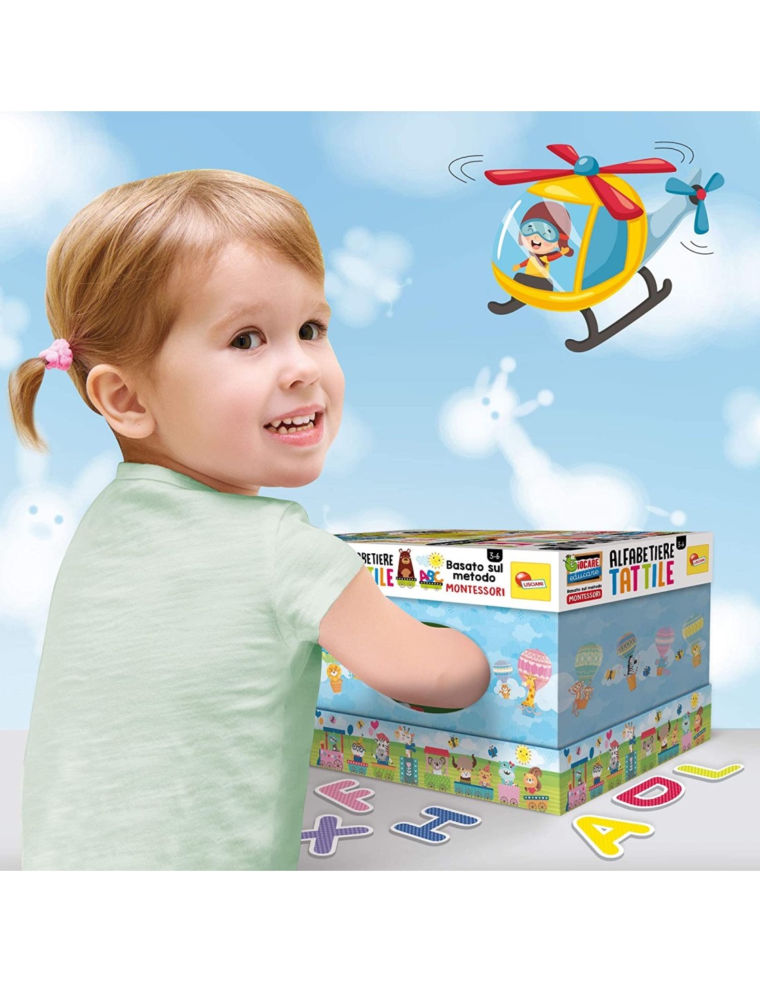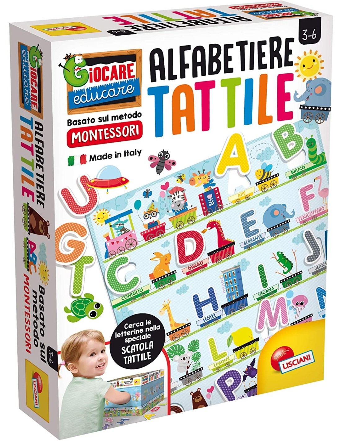 Inspirato al metodo Montessori Con la speciale scatola tattile ricomponi l'allegro alfabetiere e cerca le letterine usando solo il tatto Contiene alfabetiere, lettere sagomate, scatola tattile e istruzioni Sviluppa la memoria tattile, l'autonomia, la concentrazione, la logica, la manualità fine e la coordinazione occhio-mano Made in Italy