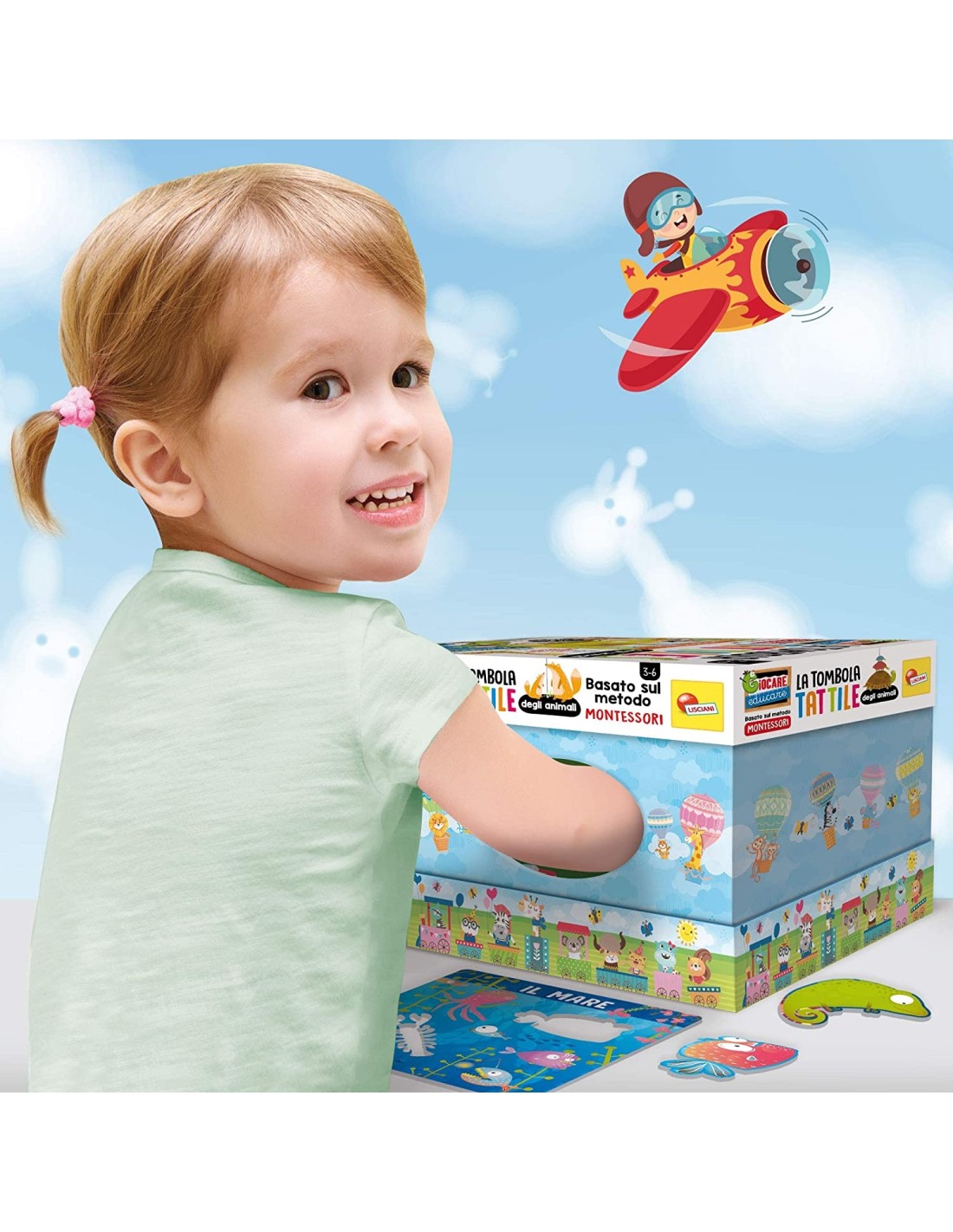 Inspirato al metodo Montessori Con la speciale scatola tattile e 6 cartelle degli ambienti, cerca gli animali usando il tatto Contiene 6 cartelle degli ambienti, animali sagomati, scatola tattile e istruzioni Sviluppa la memoria tattile, l'autonomia, la concentrazione, la logica, la manualità fine e la coordinazione occhio-mano Made in Italy