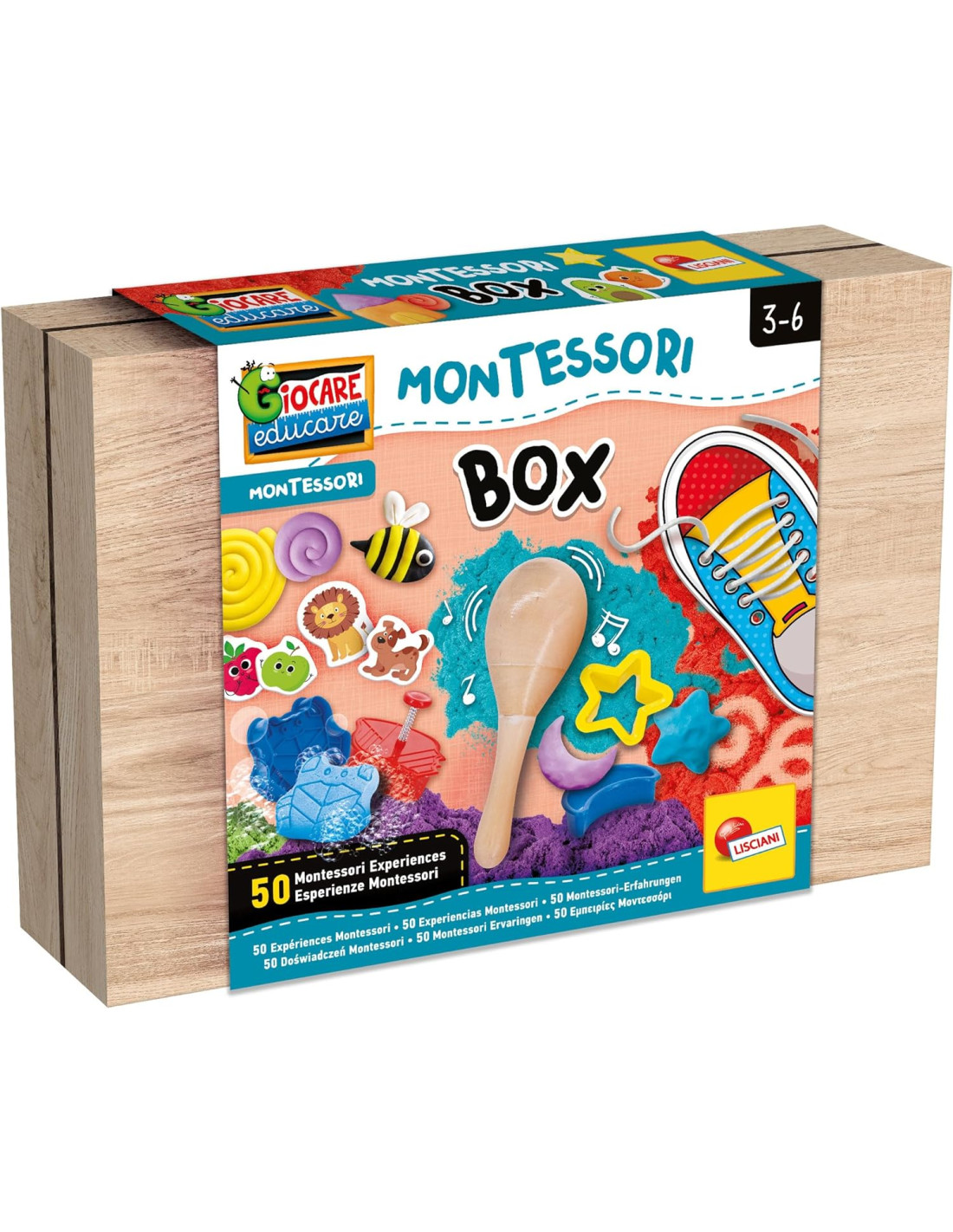 Un vero e proprio laboratorio con 50 attività basate sul metodo Montessori. Questo kit, ricco di materiali, permette al bambino di fare esercizi educativi basati sull'esperienza. Speciale scatola in legno Ricco di materiali Esperienze sensoriali
