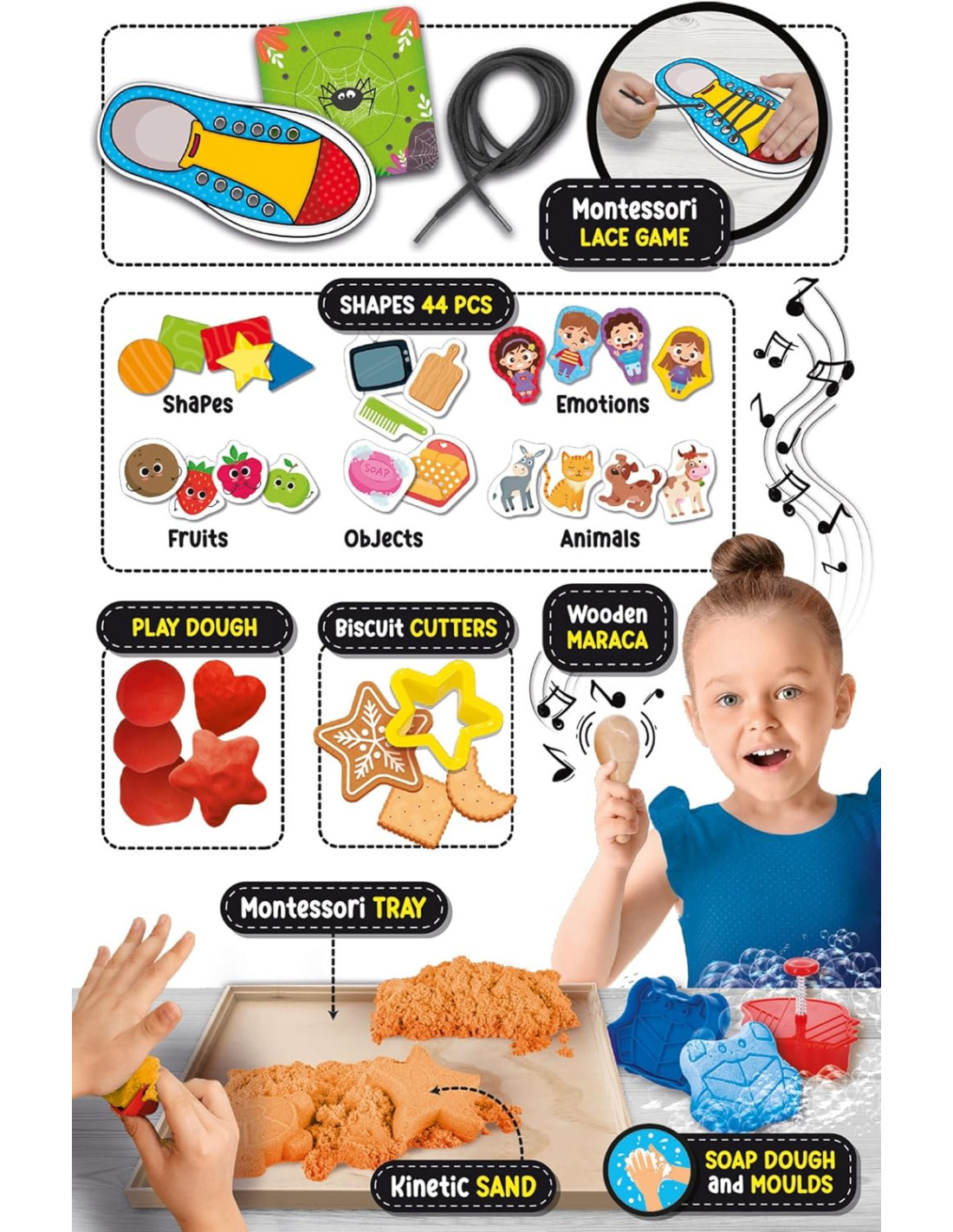 Questo kit, ricco di materiali, permette al bambino di fare esercizi eductivi basati sull'esperienza. 50 esperienze Montessori. Speciale scatola in legno - ricco di materiali -Esperienze sensoriali Cards - Schede attività - sabbia - lavagne - istruzioni - Capacità sensoriali - Coordianzione occhio-mano - Sviluppo della creatività - Autonomia