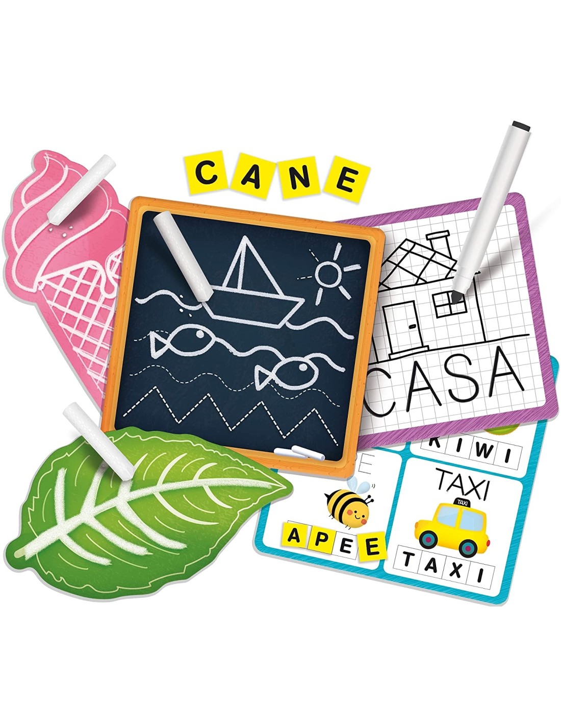 Contenuto: Lavagne scrivi e cancella- Lavagna gesso, lavagna magnetica, magnetini, gessi, pennarello scrivi e cancella, cancellino, istruzioni