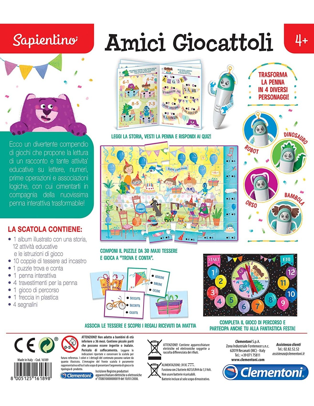 Contiene un album illustrato che racconta una storia e propone attività educative su forme, colori, associazioni logiche sulle caratteristiche degli animali. Il bambino potrà vestire la penna elettronica con i tanti accessori in cartoncino colorato trasformandola in 4 buffi personaggi. Contiene anche un puzzle trova e conta e delle tessere a incastro con quiz educativi.