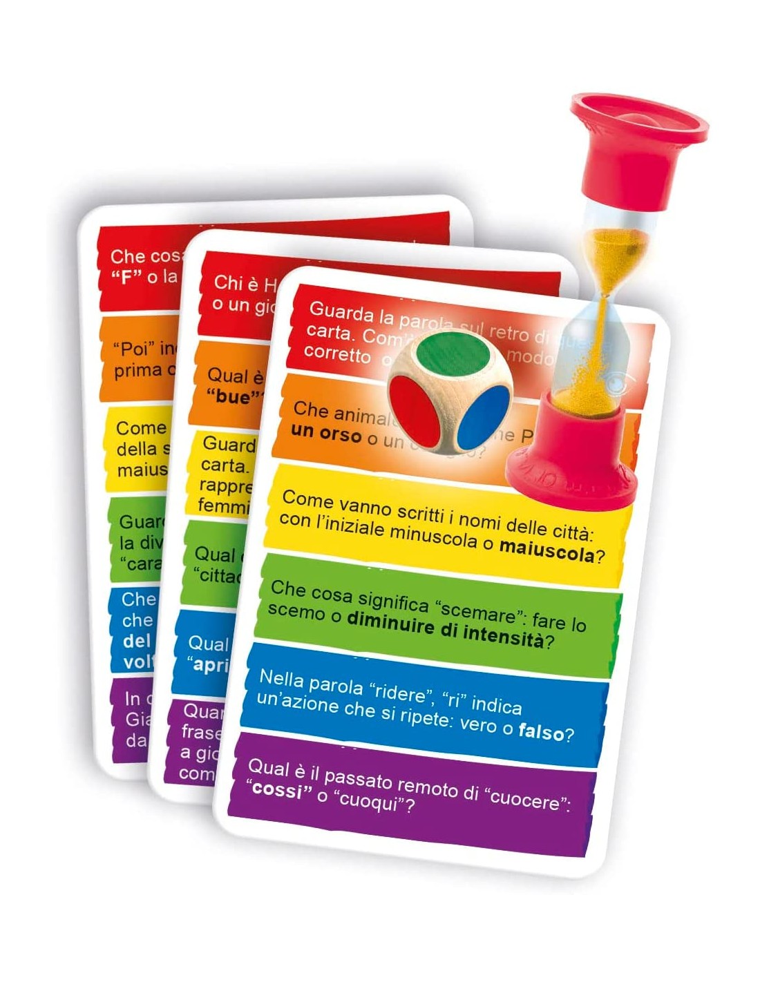 QUIZ SAPIENTINO: Carte quiz per sfidare gli amici in una divertente gara a tempo, rispondendo a divertenti domande sull'italiano CONTENUTO DEL GIOCO: un mazzo da 50 carte, un dado con facce colorate, una clessidra CARATTERISTICHE: Le carte sono fronte-retro: da un lato presentano un'immagine, dall'altro 6 domande, alcune legate alla materia, altre riferite all'immagine FLASHCARDS CLEMENTONI: La collezione di carte AllenaMente è studiata sui programmi della scuola primaria. Colleziona tutte le carte Sapientino! GIOCO EDUCATIVO: un gioco Sapientino Più per bambini dai 6 anni. Made in Italy