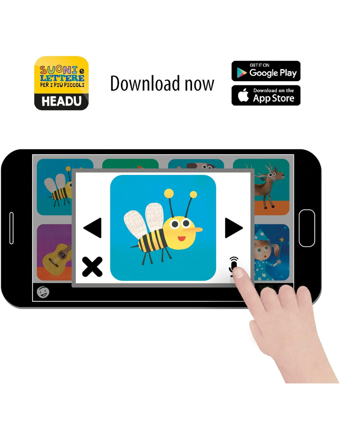 OTTIMI CONTENUTI per giocare in più modi e divertirsi imparando: 32 grandi tessere dei soggetti e delle lettere con effetto tattile, una guida didattica per genitori ed educatori.