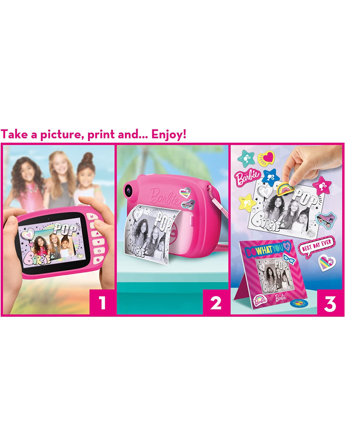 La fotocamera istantanea di barbie Stampa subito le tue foto, funzione video e selfie, colleziona le tue foto, crea effetti Pensiero creativo, autonomia, espressività 3 rotoli per 180 foto, laccio per appendere la camera, 10 cornici in cartoncino, cavo per ricarica, istruzioni Peso: 0.3 kilograms