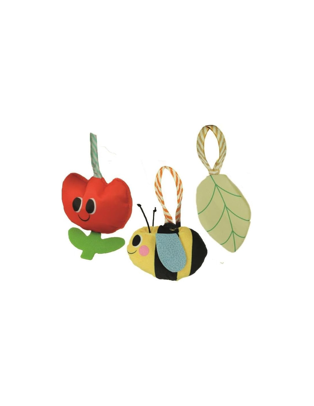 Al fiore sono appesi una foglia con elemento frusciante, un'apetta sonaglio e un tulipano con uno squeaker.
