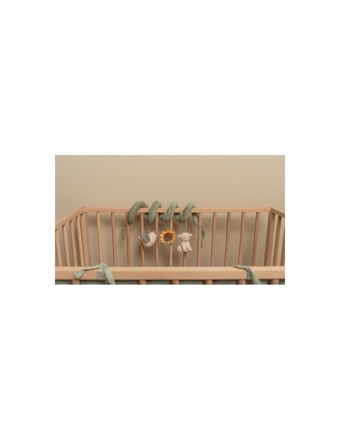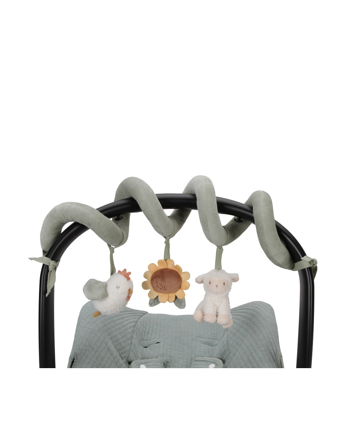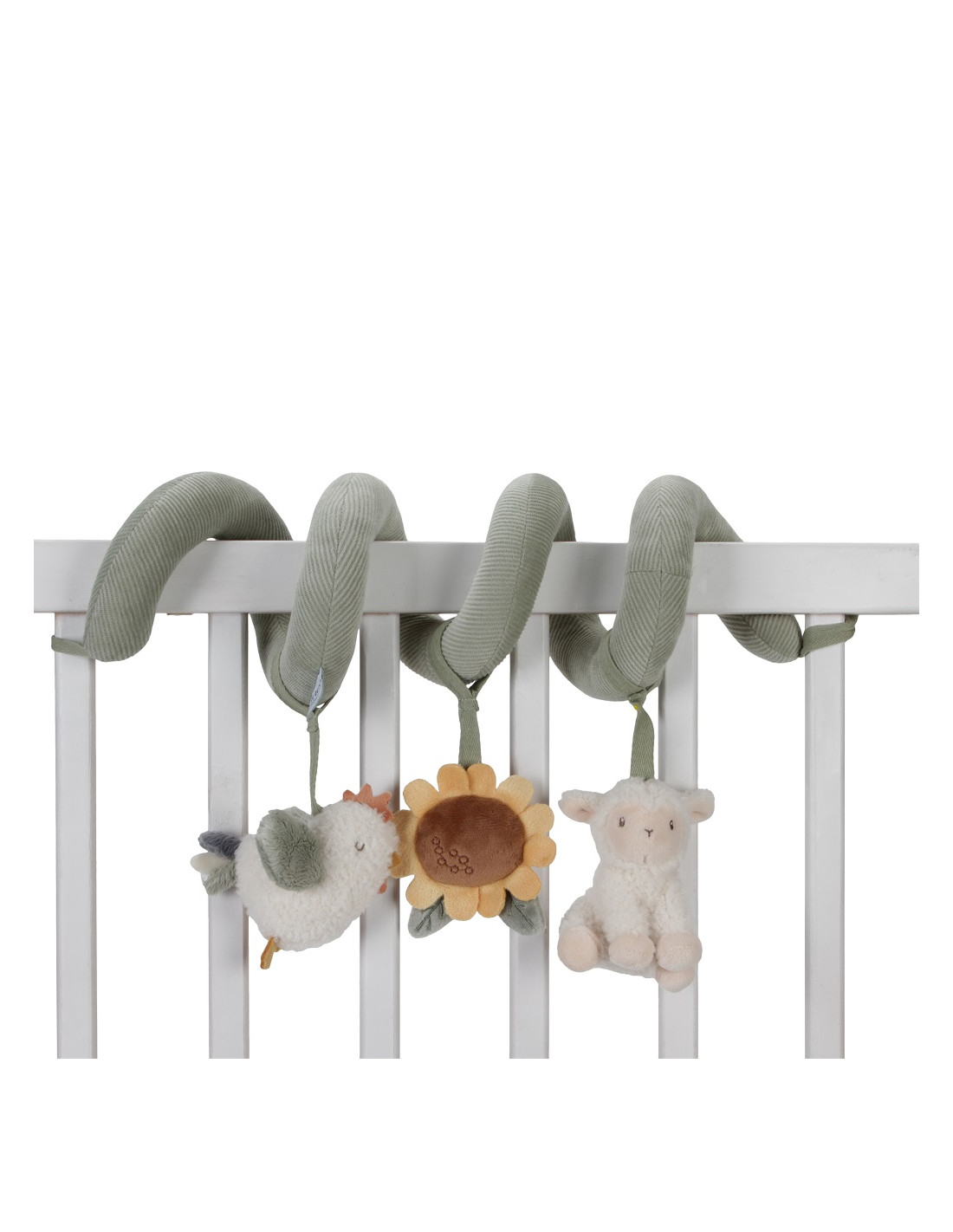 La spirale delle attività è realizzata in velluto a coste con cotone e presenta una piccola pecora, un allegro pollo e un bellissimo girasole