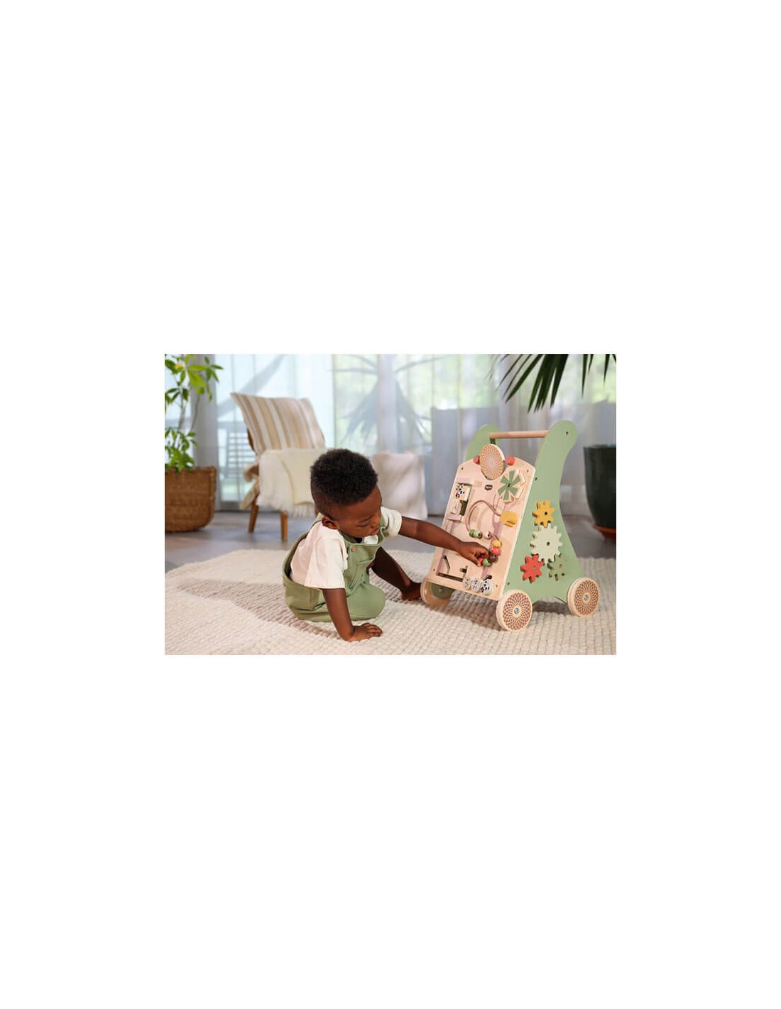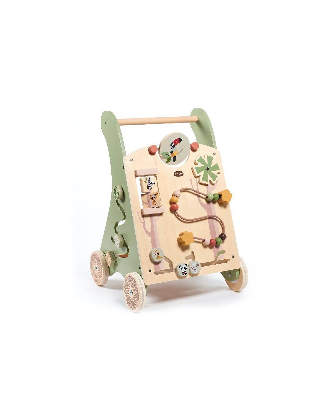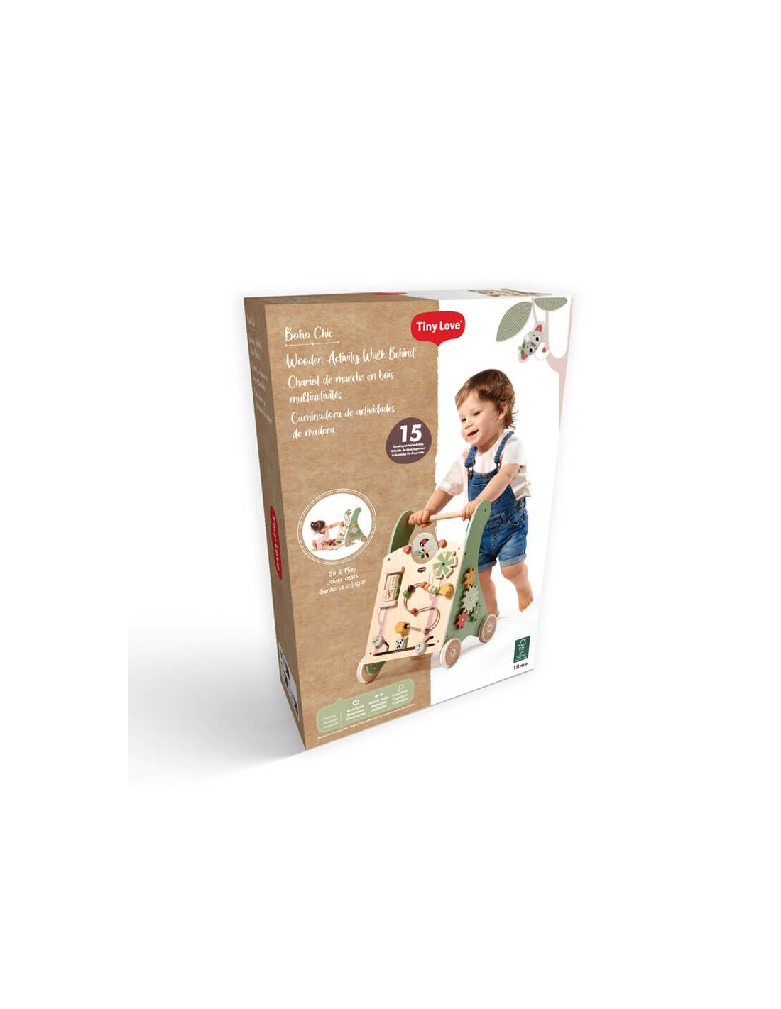 Caratterizzato da un design giocoso e costruito con legno di alta qualità proveniente da foreste gestite in modo sostenibile, il carrello da passeggio in legno Boho Chic Tiny Love incoraggia la crescita e lo sviluppo del tuo piccolo con le sue 12 divertenti attività.